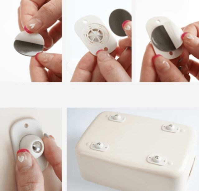 Kolay kurulum: Sadece onunla birlikte gelen kendinden kilitli cihazı kullanmanız gerekir. Tekerlekleri, birlikte verilen kendinden yapışkanlı bantla nesnenin altına yapıştırmanız yeterlidir. Delme gerektirmez ve nesneye zarar vermez. 24 saat beklemeniz önerilir, daha sıkı yapışır.