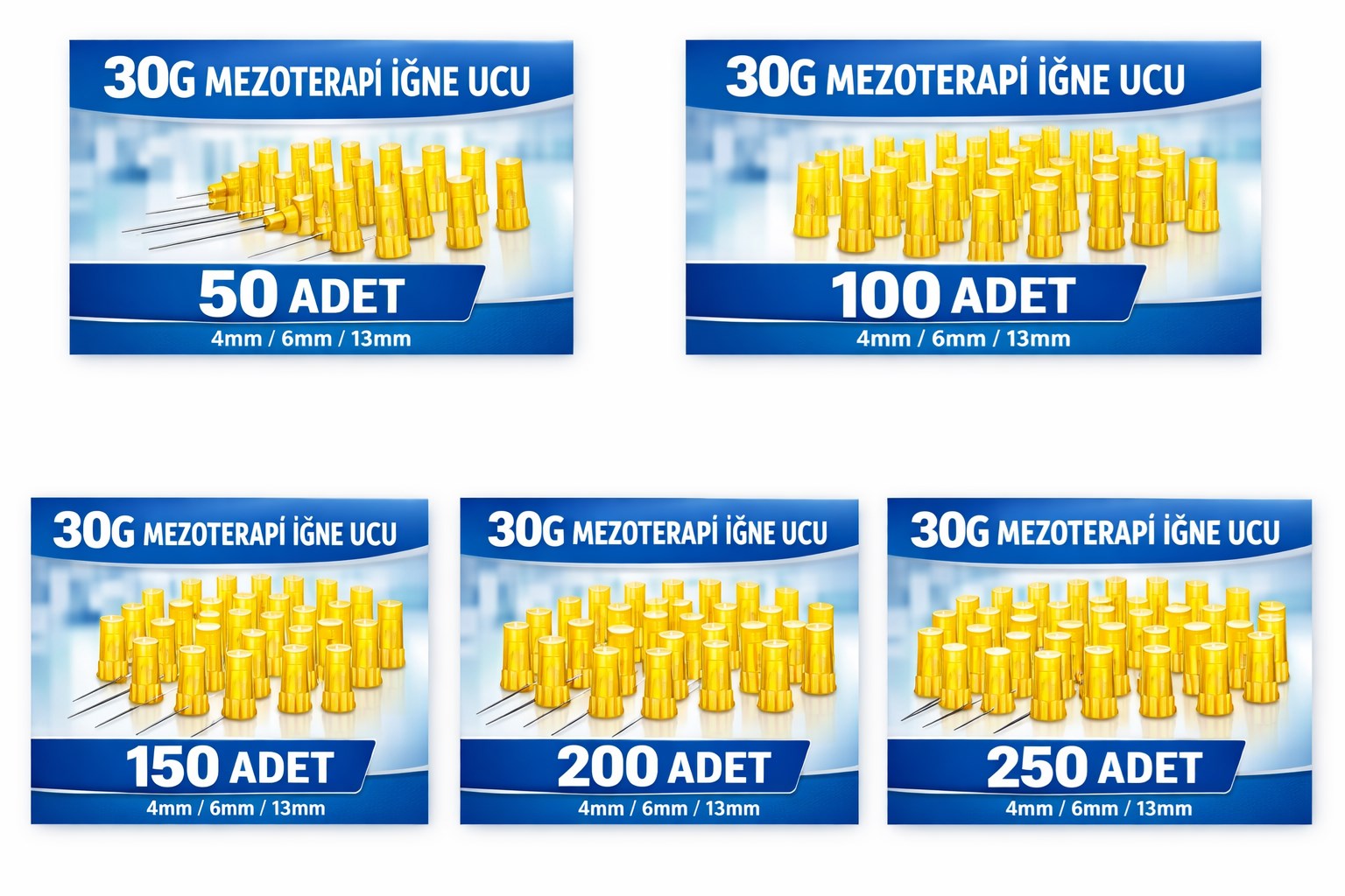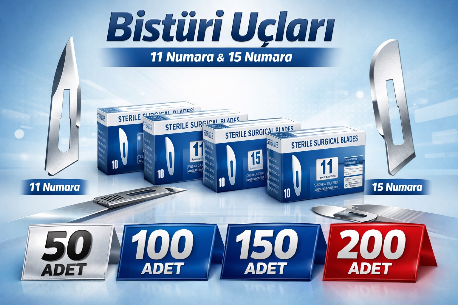 50 adet bistüri ucu, 100 adet bistüri ucu, 150 adet bistüri ucu ve 200 adet bistüri ucu varyasyonları mevcuttur.