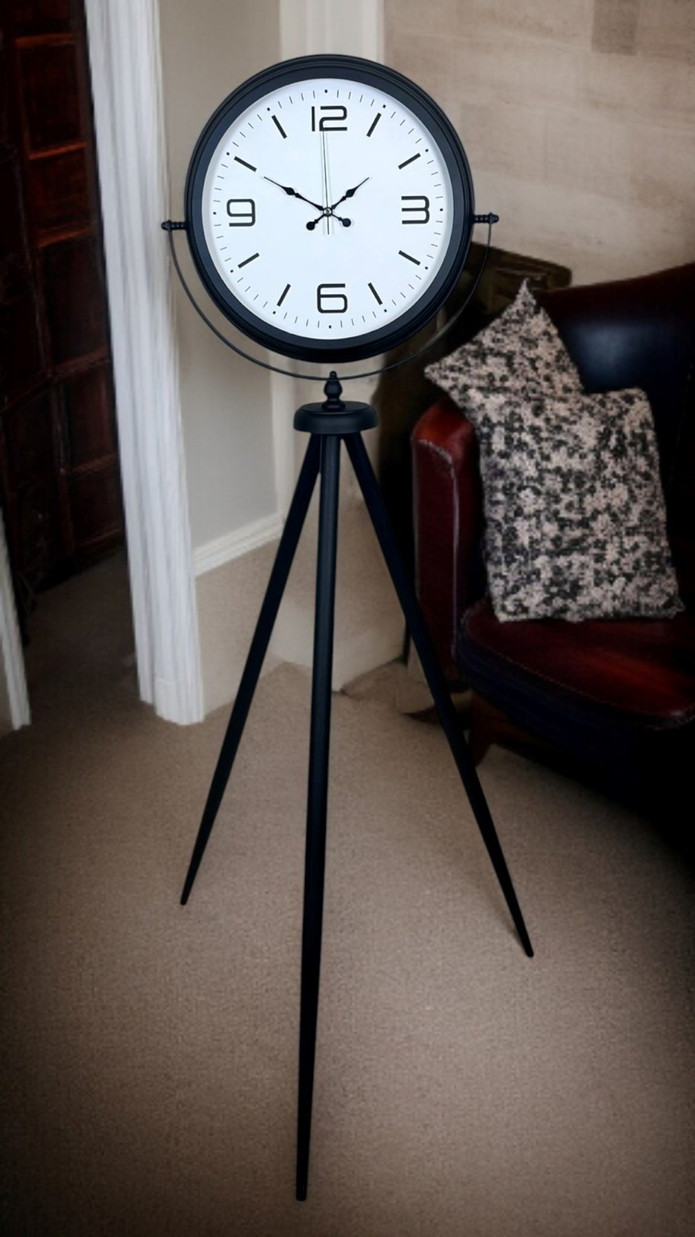 Bu özel tasarım sadece bir saat değil; aynı zamanda salon köşelerinde, antrelerde, mağaza vitrinlerinde ve ofislerde dekorun tamamlayıcısı olan şık bir tasarım objesidir. Tripod ayak yapısı zeminde dengeli duruş sağlar; bulunduğu alanda “vitrinlik” bir görünüm sunar.