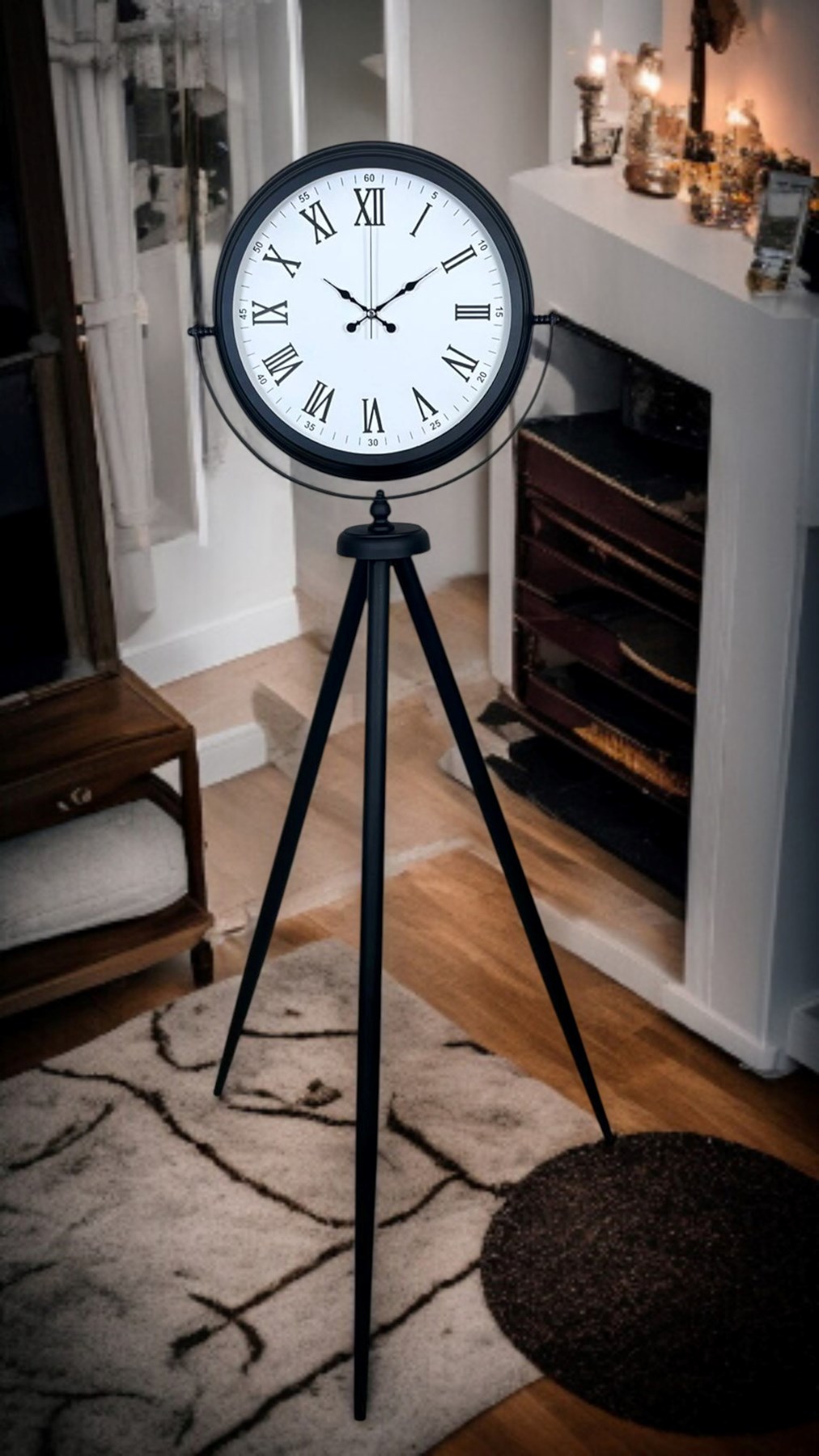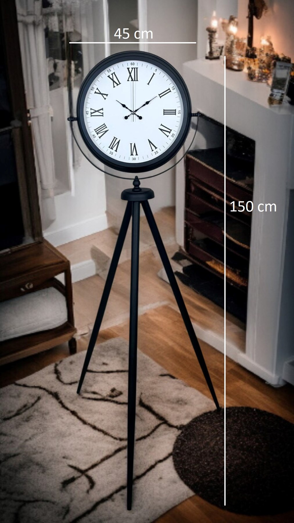 Klasik kadran şıklığını modern tripod tasarımla buluşturan Siyah Tripod Ayaklı Dekoratif Salon Saati, 150 x 45 cm ölçüsüyle salon, ofis ve geniş yaşam alanlarında etkileyici bir duruş sergiler. Siyah metal tripod ayak yapısı, mekâna modern ve güçlü bir karakter kazandırırken; beyaz kadran üzerindeki Roma rakamları saate zamansız bir zarafet katar. Bu özel tasarım, sadece zamanı göstermekle kalmaz; aynı zamanda bulunduğu ortamda “vitrinlik” bir dekor objesi etkisi oluşturur.