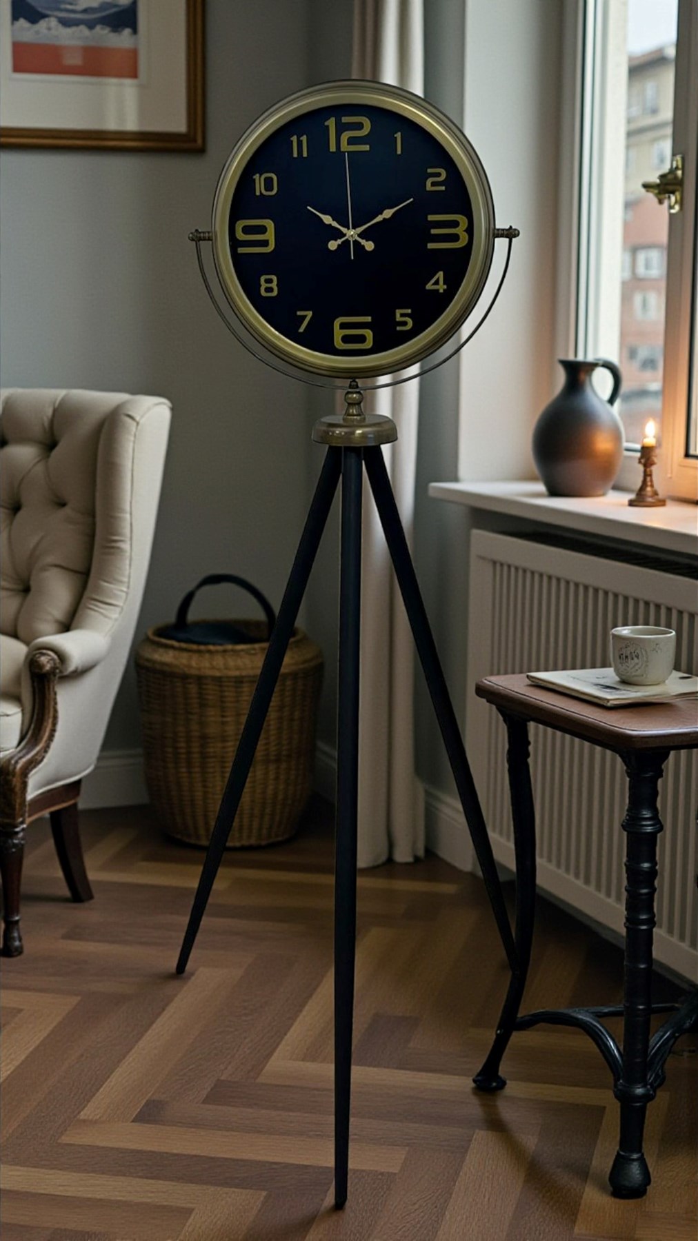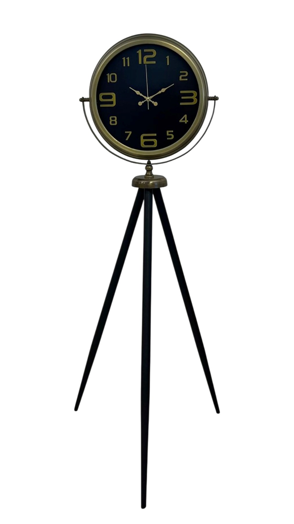 Tripod ayaklı yapısı sayesinde duvara montaj gerektirmeden kullanılır; taşıması ve konumlandırması pratiktir. Üst bölümdeki çerçeveli tasarım ve dengeli ayak yapısı hem görsel olarak “tasarım ürünü” hissi verir hem de zeminde sağlam duruş sağlar. Büyük kadran yapısı uzaktan kolay okunur; dekoratif rakam ve ibre tasarımıyla mekâna sofistike bir dokunuş ekler.