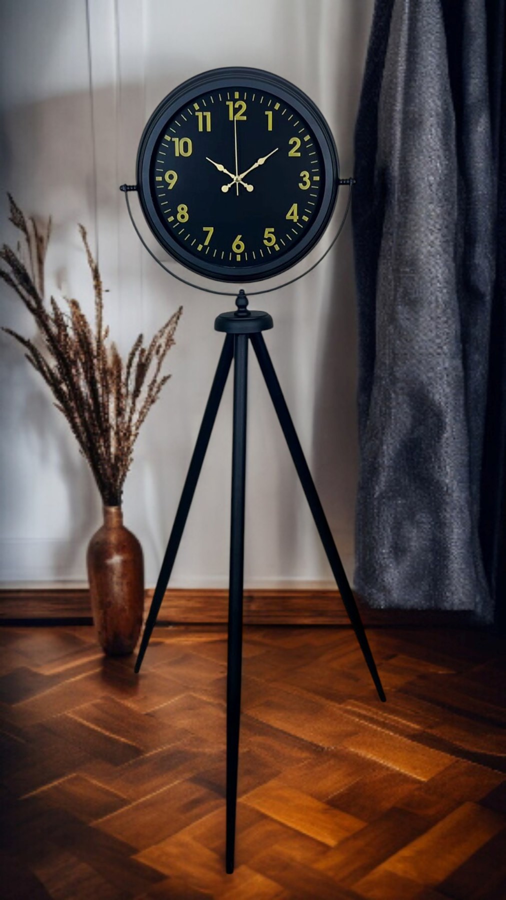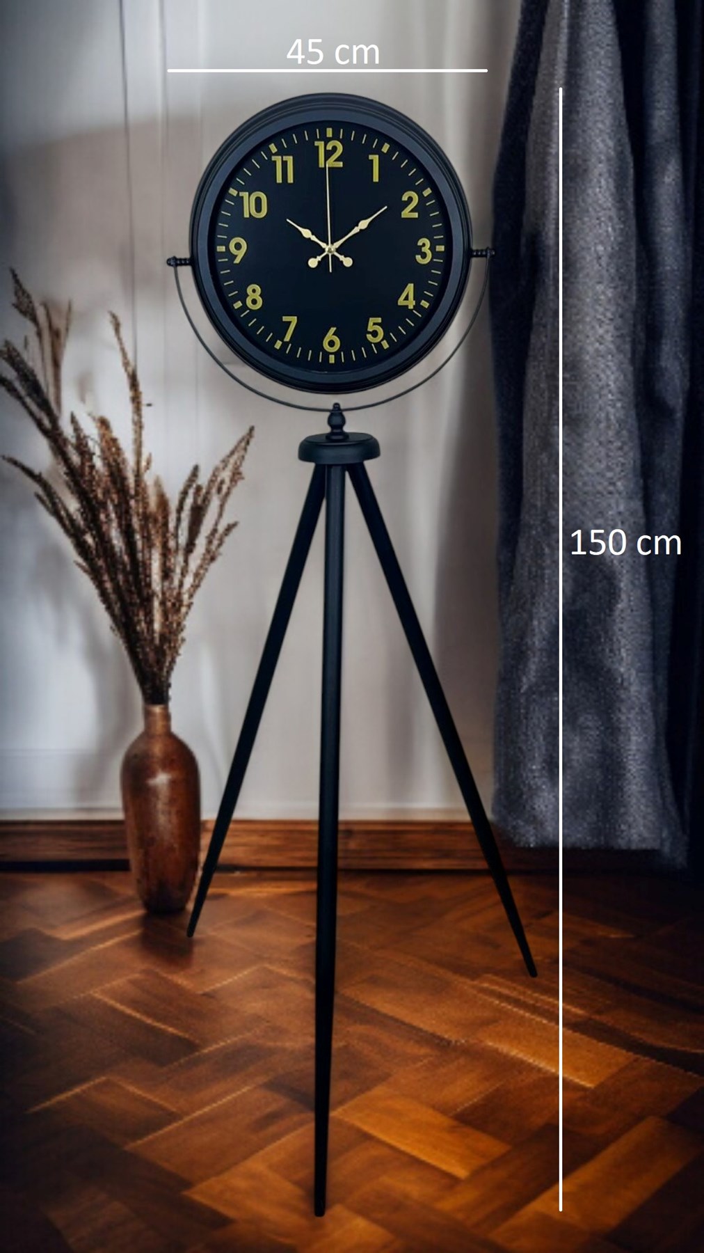 Yaşam alanınıza güçlü bir duruş ve premium bir şıklık kazandıran Siyah Tripod Ayaklı Dekoratif Salon Saati, 150 x 45 cm ölçüsüyle salon, ofis ve geniş mekanlarda dikkat çeken bir dekor objesidir. Siyah metal tripod ayak tasarımı modern, loft ve endüstriyel dekorasyonlarla kusursuz uyum sağlarken; siyah kadran üzerinde yer alan gold rakamlar ve gold ibreler ürüne lüks bir görünüm katar. Bu kontrast tasarım sayesinde saat, bulunduğu ortamda “vitrin etkisi” oluşturur ve dekorun en güçlü tamamlayıcısı olur.