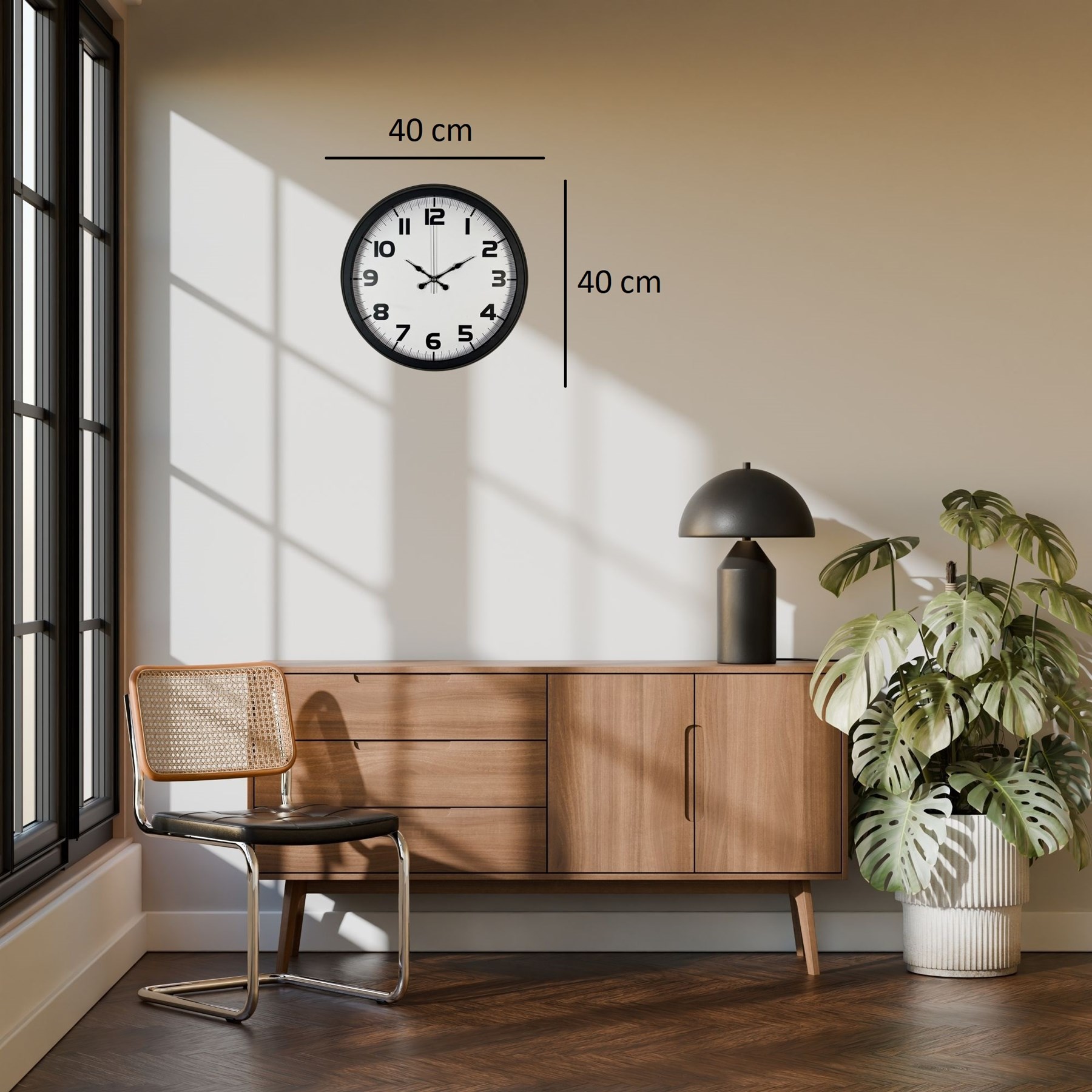 Modern ve zamansız tasarımıyla öne çıkan 40 cm siyah metal duvar saati, hem ev hem de ofis dekorasyonunda şıklığı tamamlayan güçlü bir parçadır. Siyah metal kasası ve sade beyaz kadranı sayesinde her ortama kolayca uyum sağlar. Büyük ve okunaklı rakam yapısı sayesinde zamanı rahatlıkla takip edebilirsiniz.