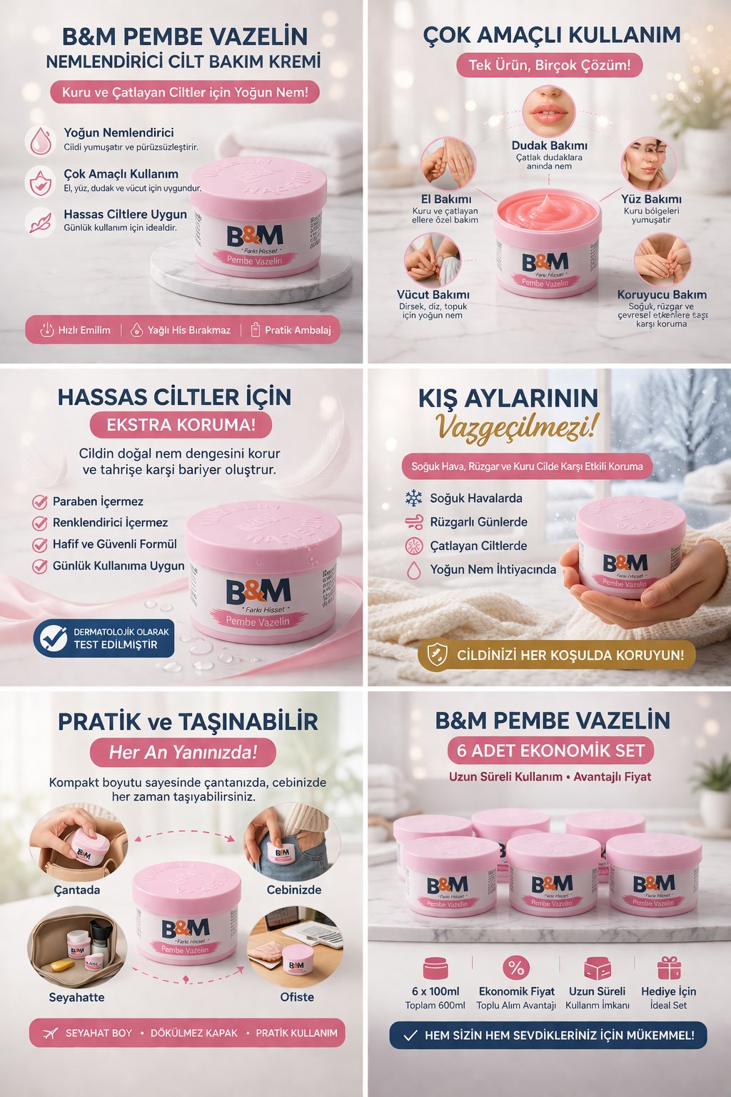 B&M Pembe Vazelin Nemlendirici Cilt Bakım Kremi Çok Amaçlı Vazelin 6 Adet