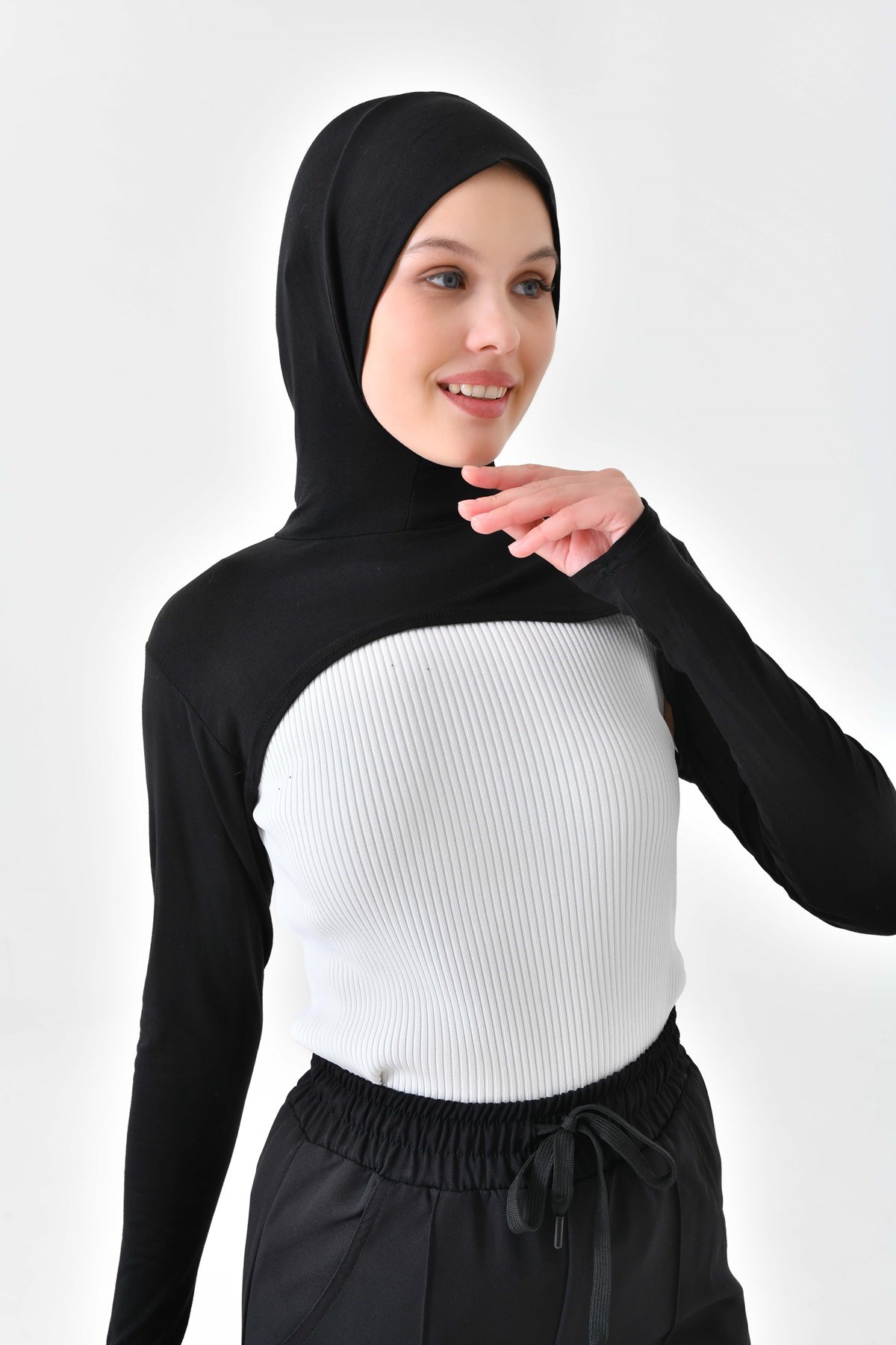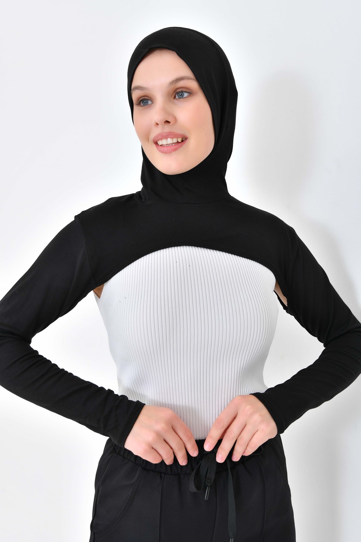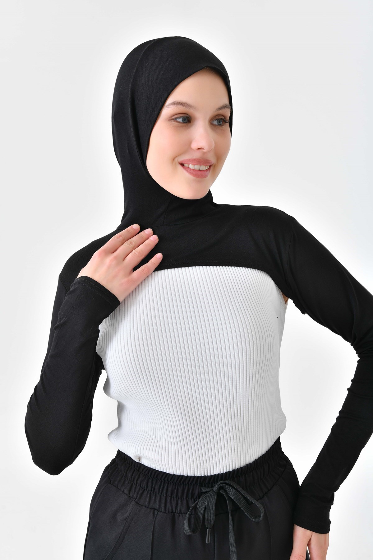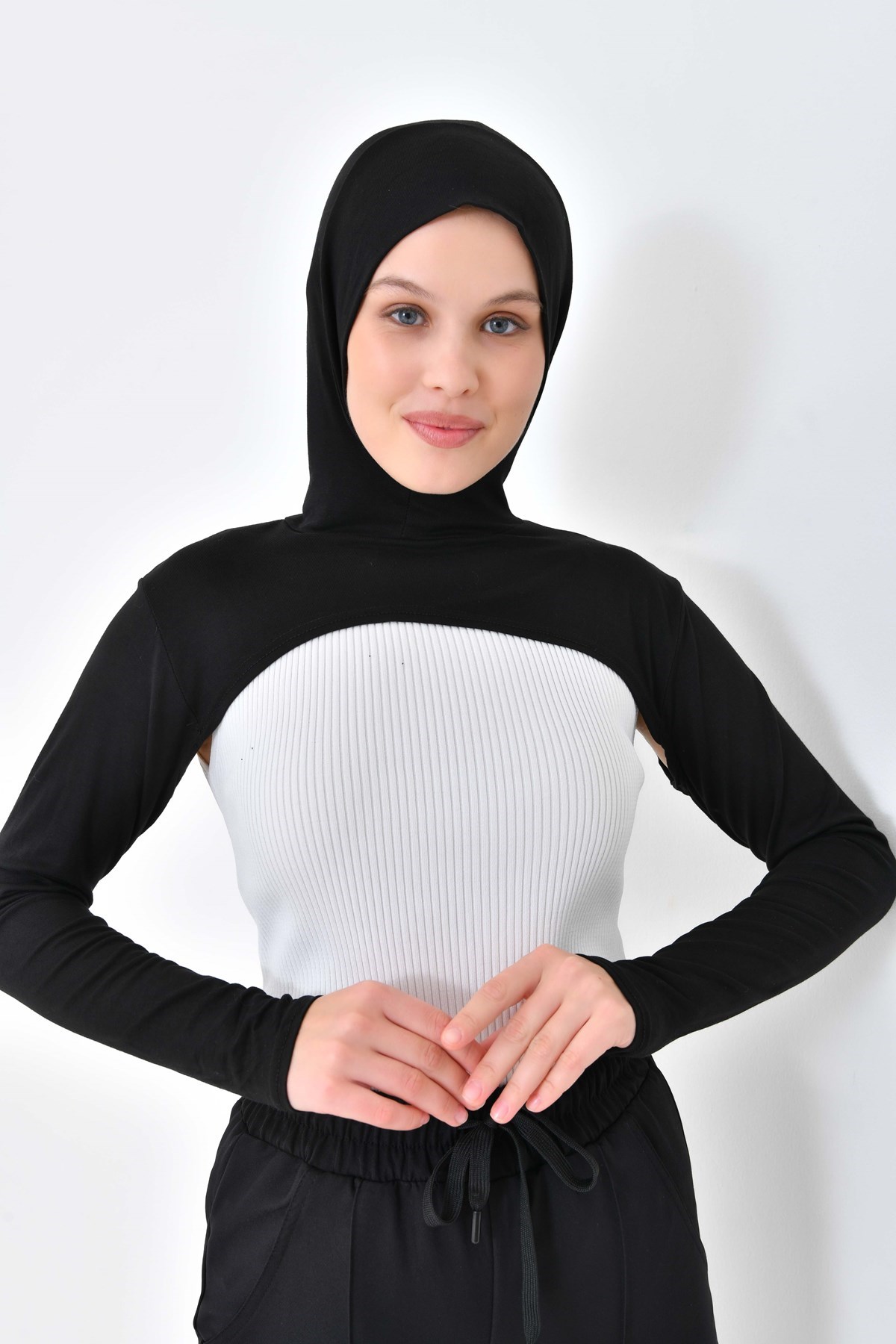 Siyah Yüksek Kaliteli Boneli Tesettür Boyunluklu Kolluk, Güneş Koruyucu Kol Örtüsü, Kapüşonlu Boyun Örtüsü, Bolero, Kapüşonlu Crop Bluz