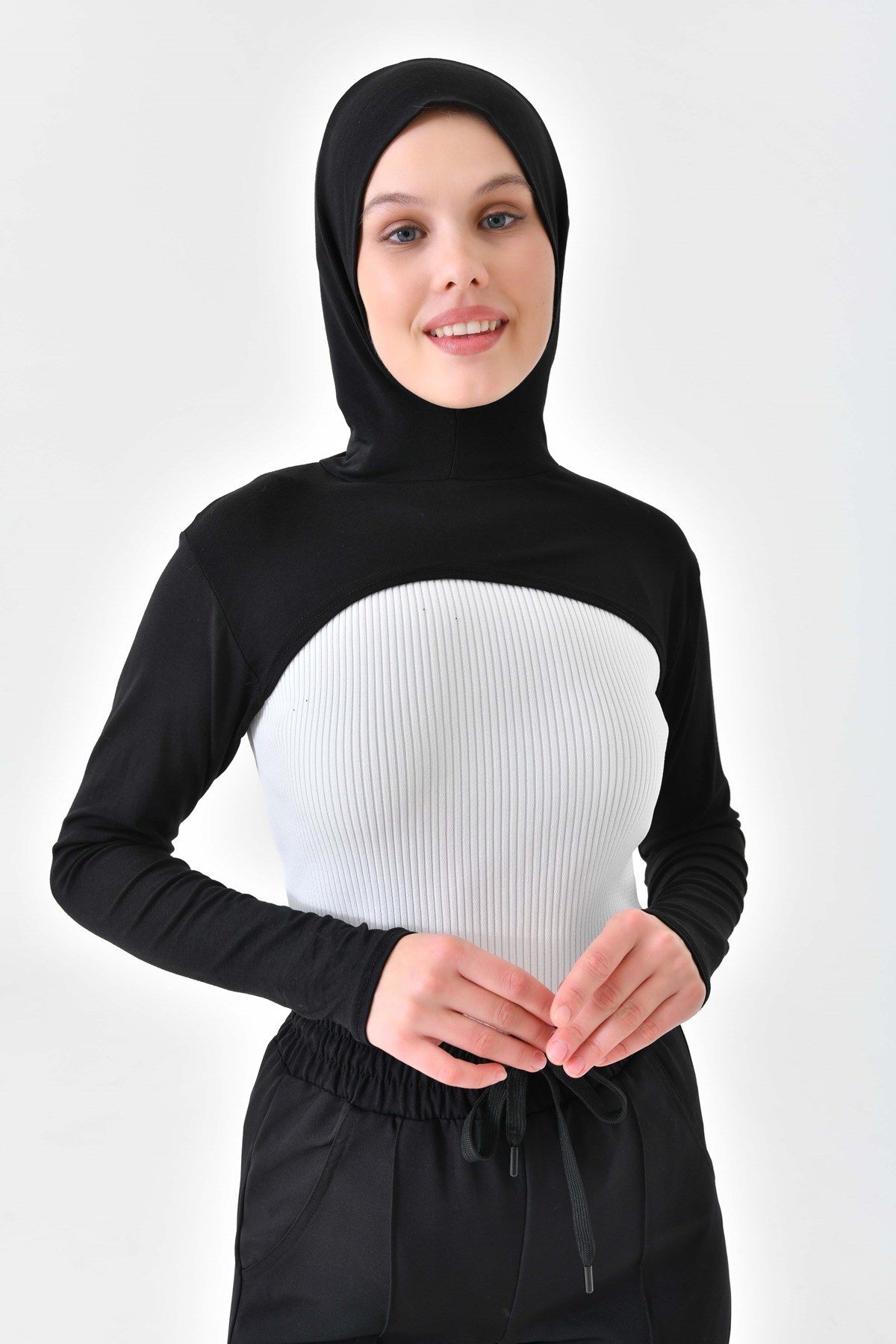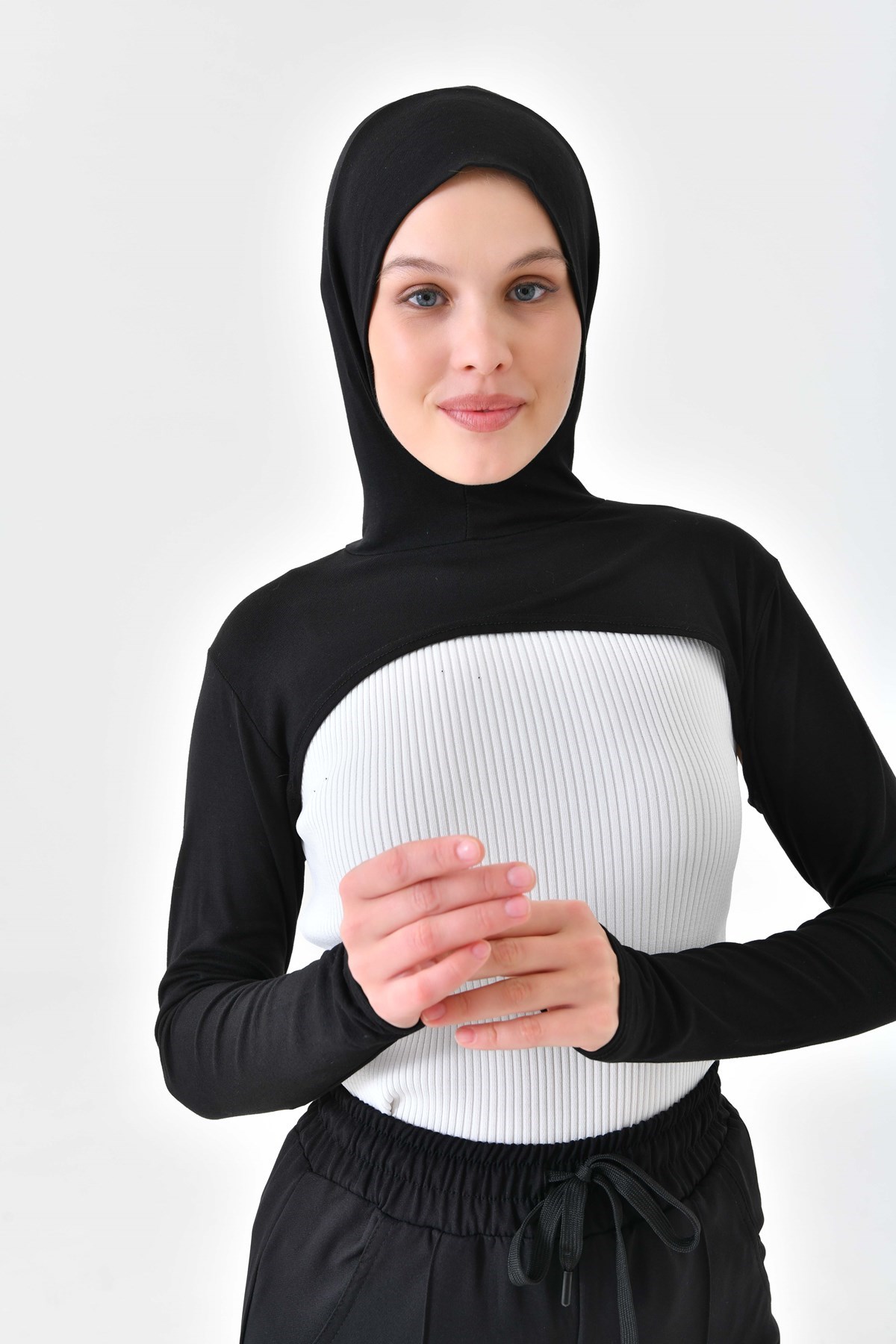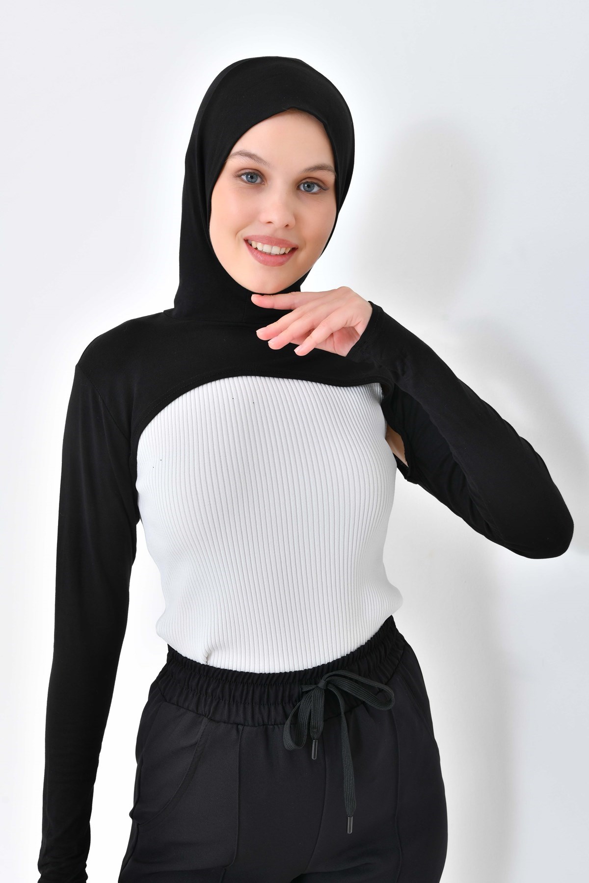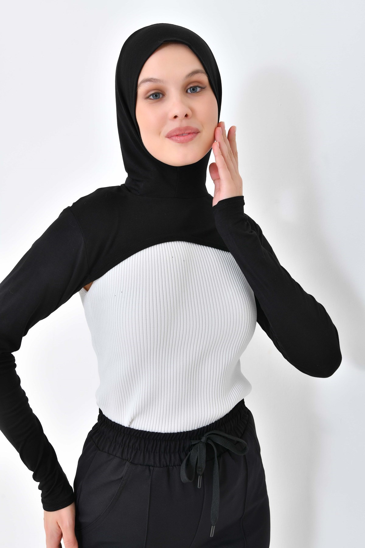 Siyah Yüksek Kaliteli Boneli Tesettür Boyunluklu Kolluk, Güneş Koruyucu Kol Örtüsü, Kapüşonlu Boyun Örtüsü, Bolero, Kapüşonlu Crop Bluz