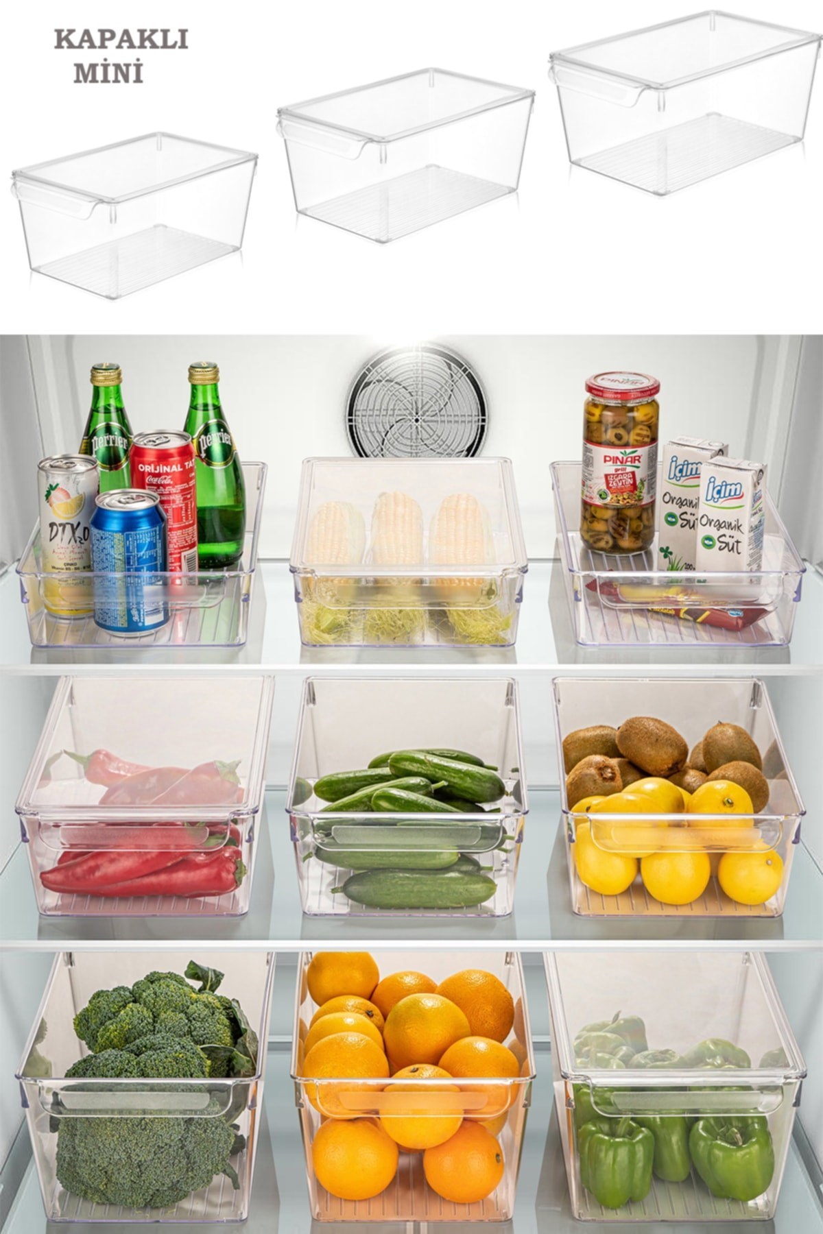 3 Adet Küçük Boy Kapaklı Buzdolabı Organizer Şeffaf Kapaklı Organizer Istiflenebilir Mini
