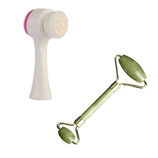 1 Adet Yeşim Taşı Çift Taraflı Cilt Masaj Aleti + 1 Adet Çift Taraflı Yüz Temizleme ve Siyah Nokta Giderici Fırça