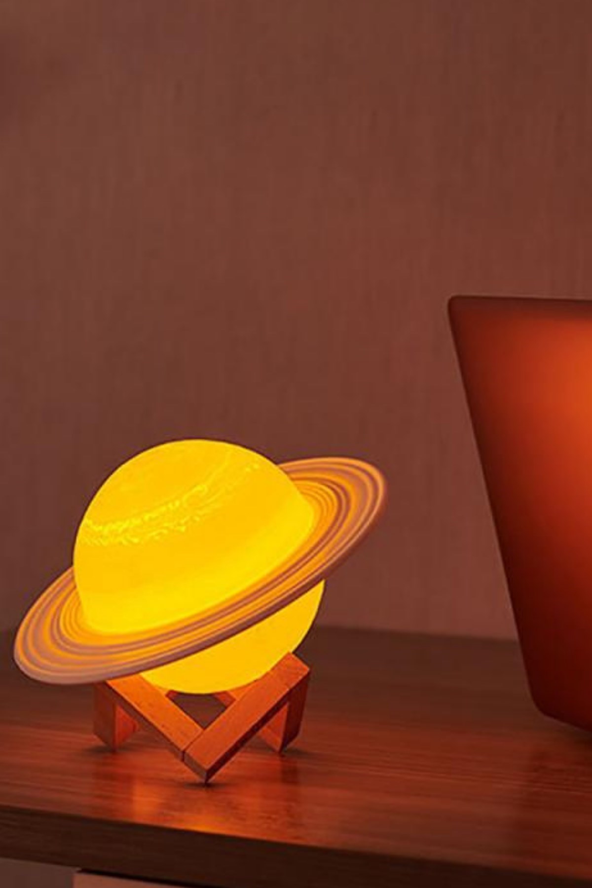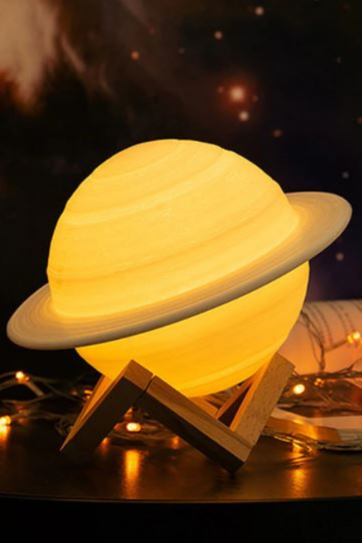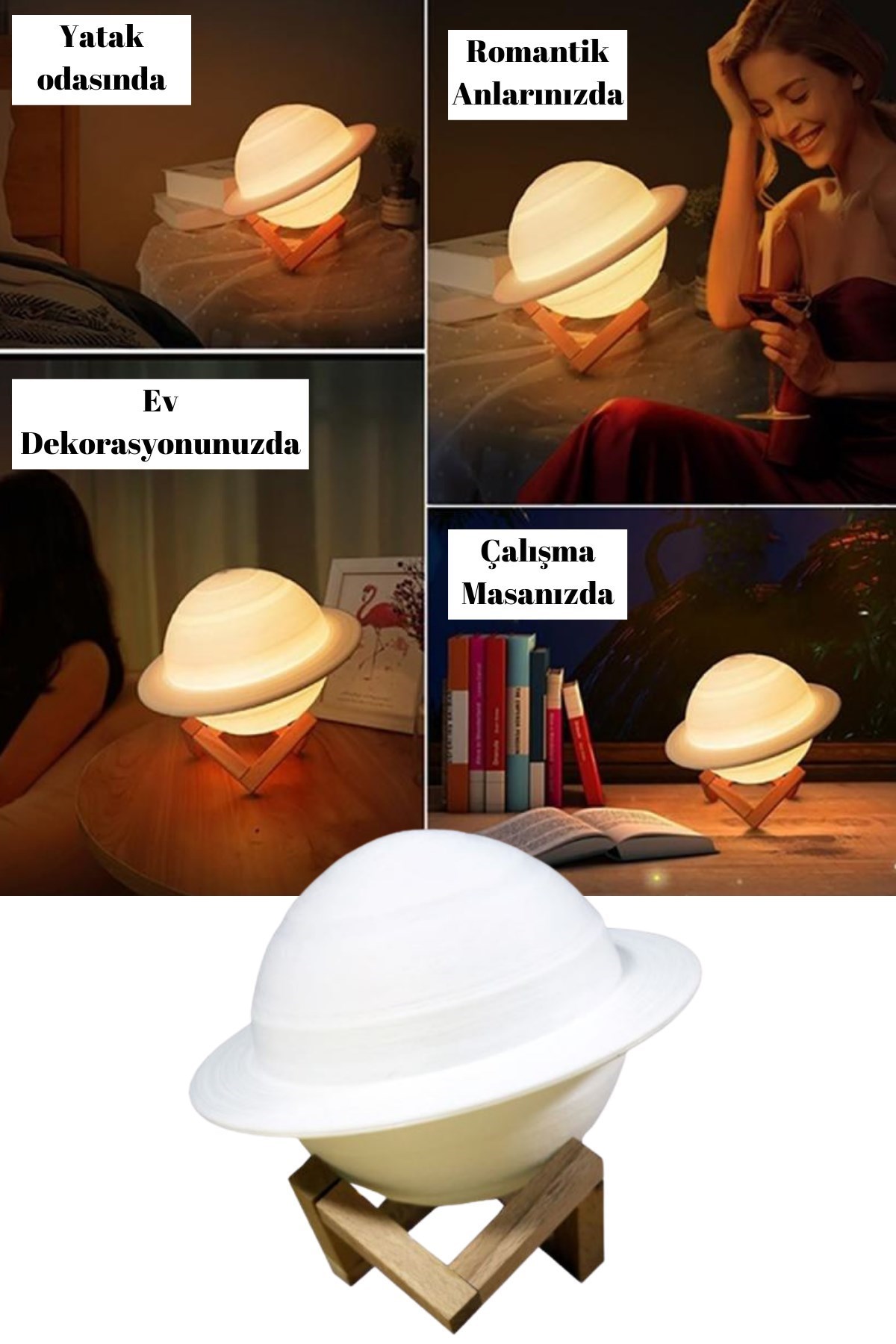 Buffer 3D Print Satürn Dokunmatik Gezegen Ahşap Stantlı 3 Renk USB Şarjlı Gece Lambası (Kumandasız)