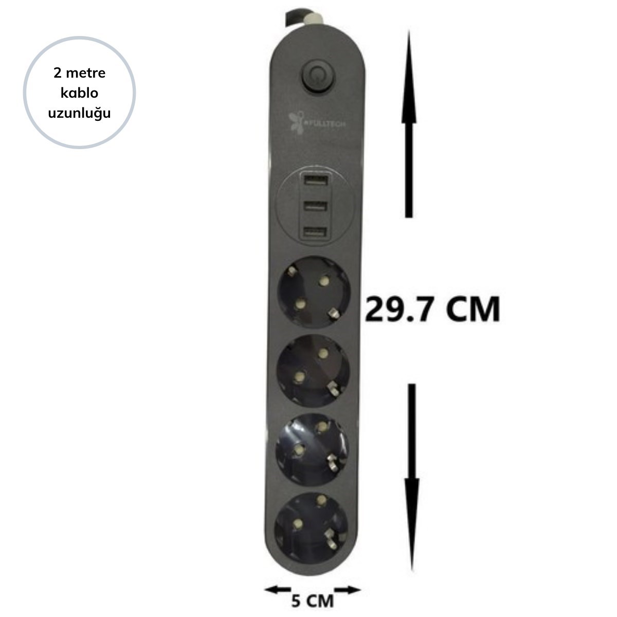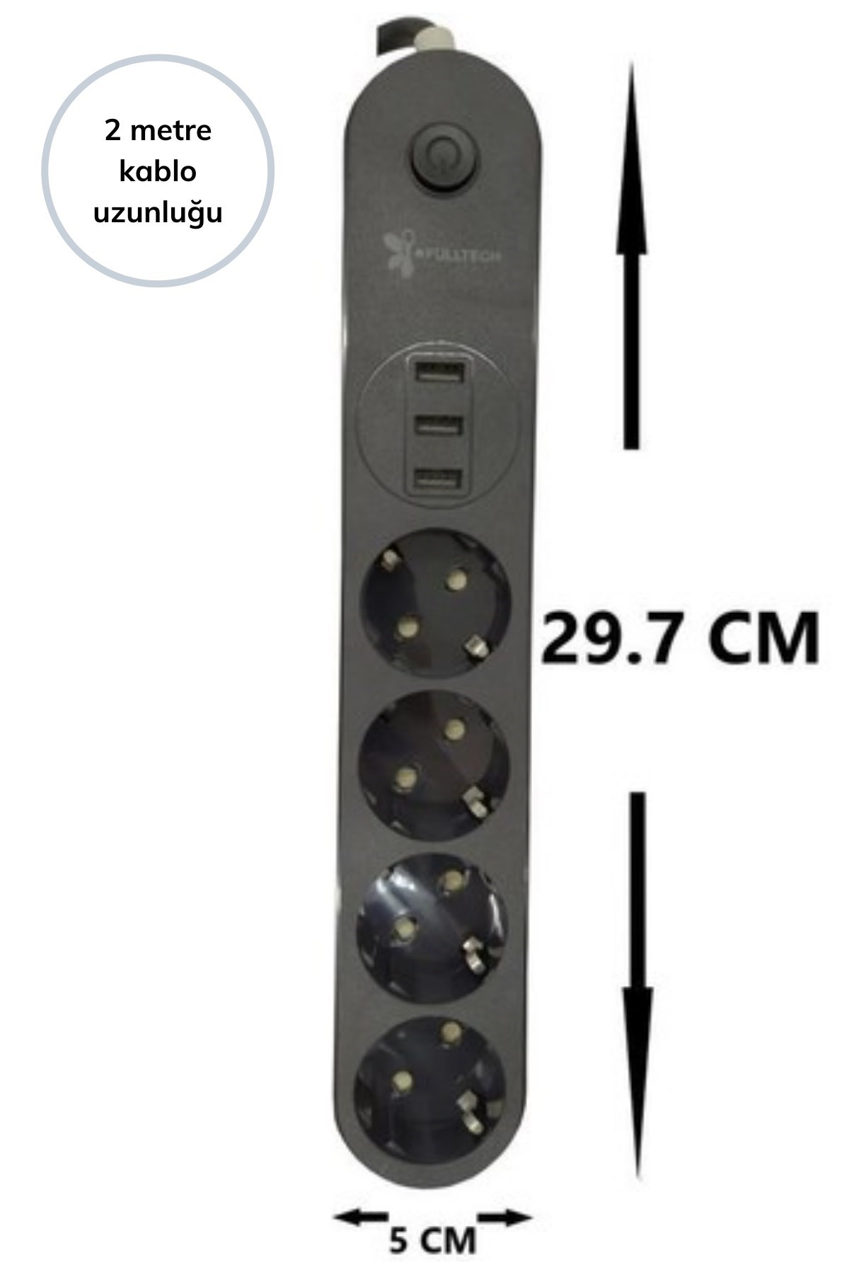 BUFFER® 4lü Siyah Anahtarlı 3 USB Li Akım Korumalı Topraklı Çocuk Korumalı Grup Priz 2 Metre