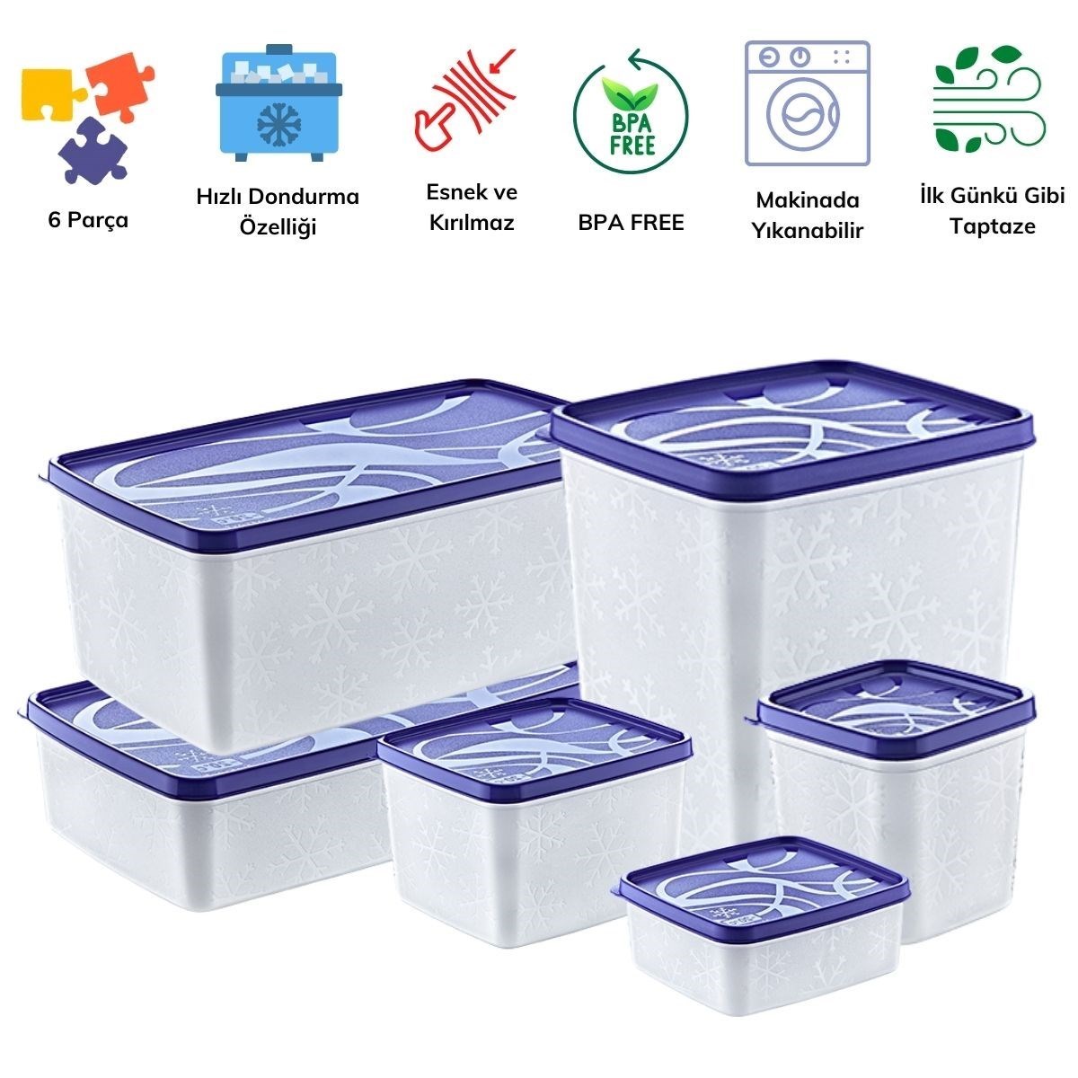 6 Parça Hızlı Dondurabilme Özellikli Saklama kapları derin dondurucuya uygundur, bulaşık makinesinde rahatça yıkanabilir özelliktedir