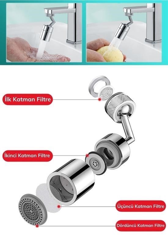BUFFER® 720 Derece Dönebilen 4 Filtreli Tüm Musluk Tipleri İle Uyumlu Montaj Aparatlı Musluk Başlığı