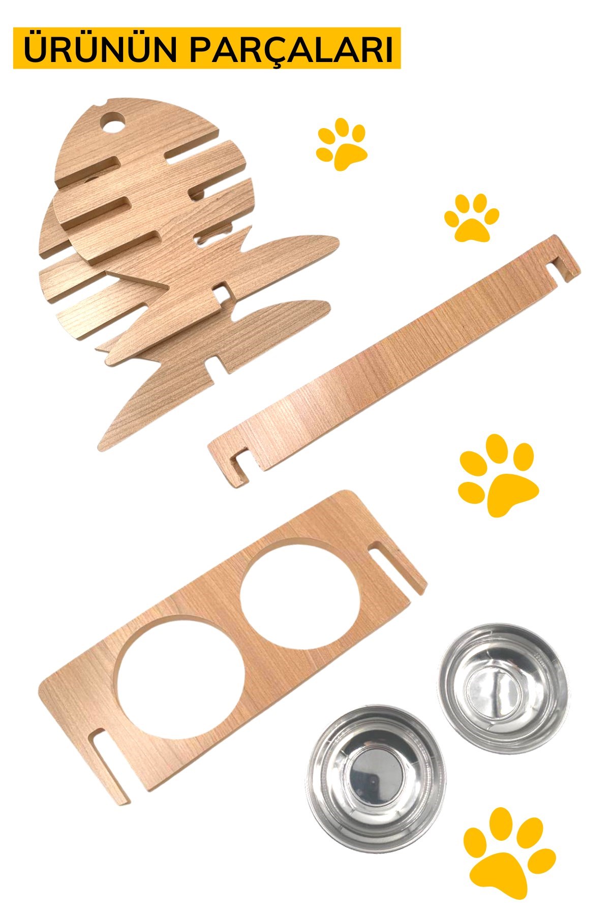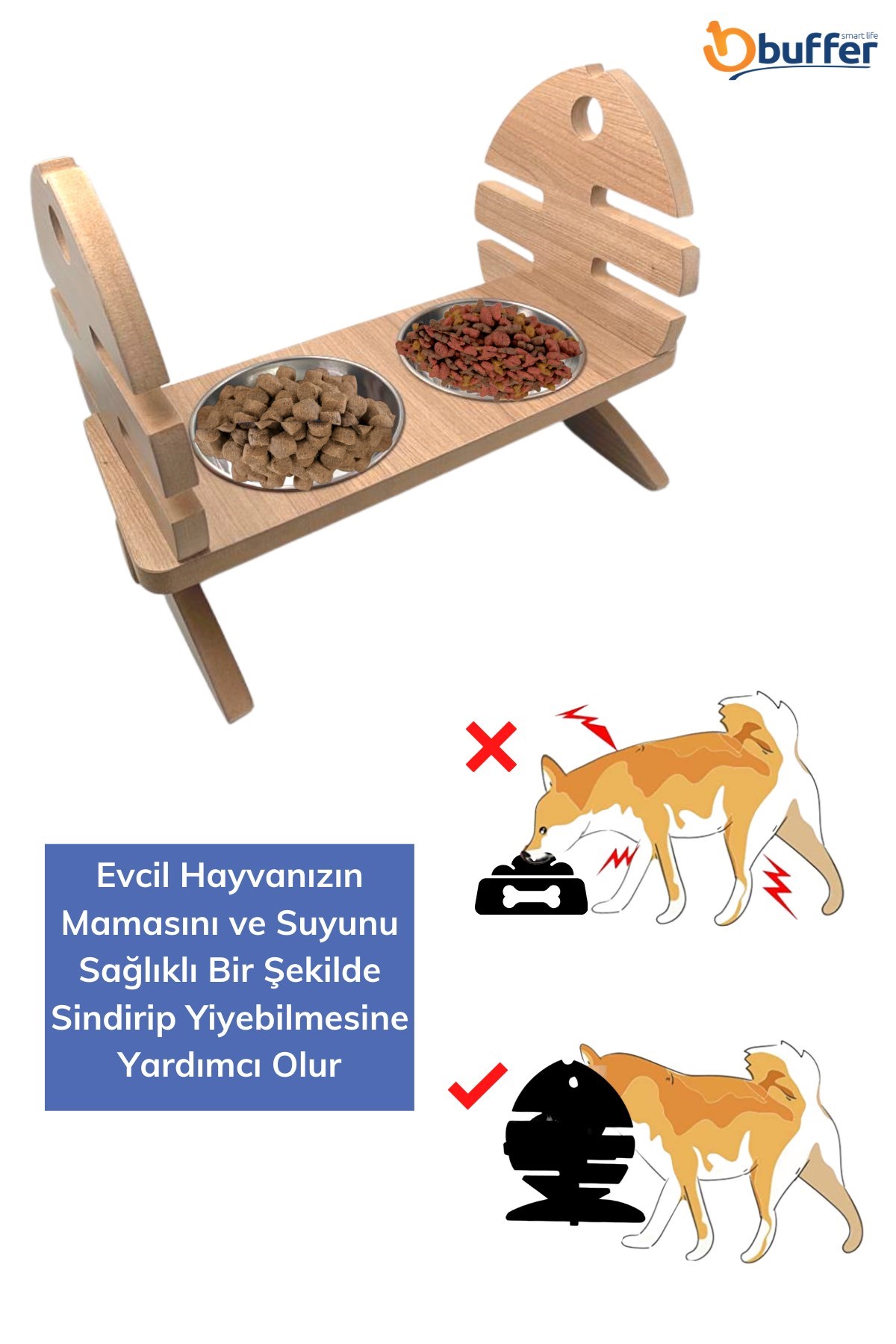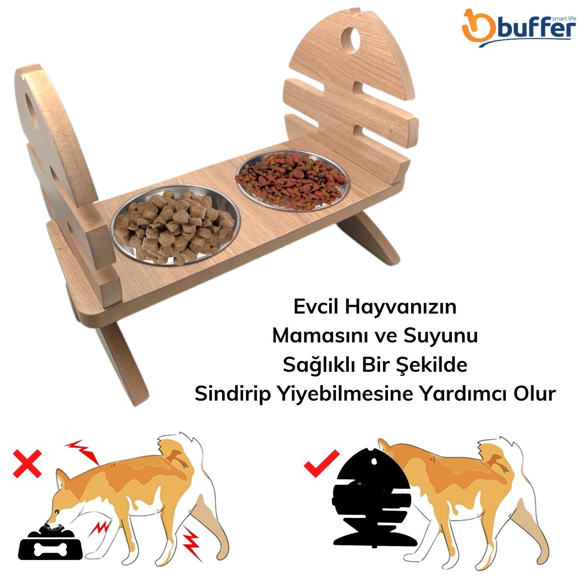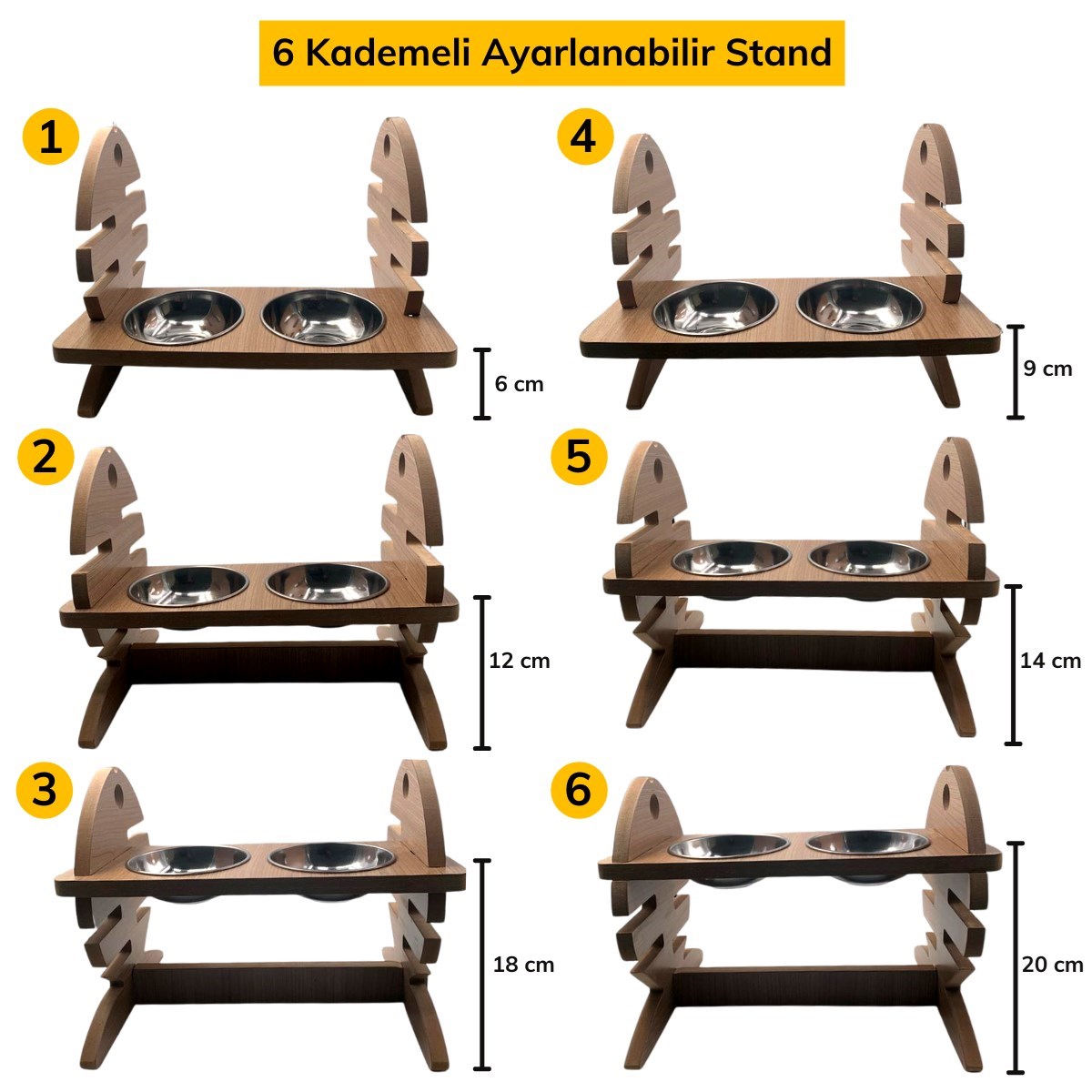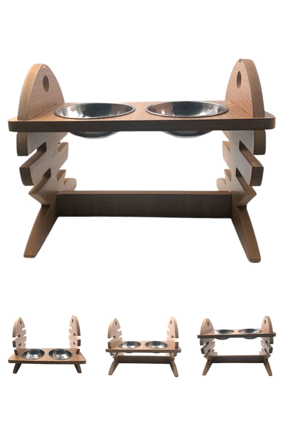 Buffer Ahşap Kedi Köpek Tavşan 6 Kademeli Ayarlanabilir İkili Paslanmaz Çelik Kase Su Mama Standı