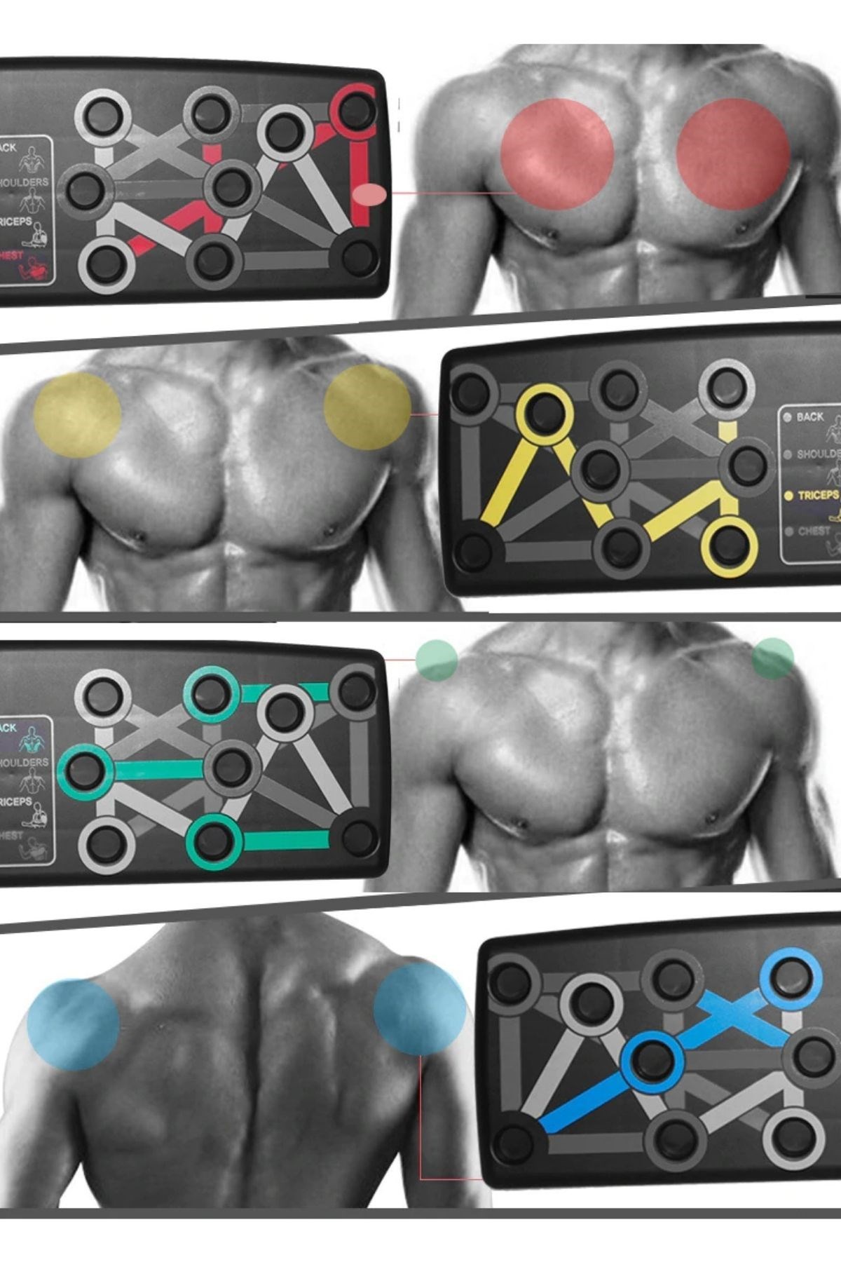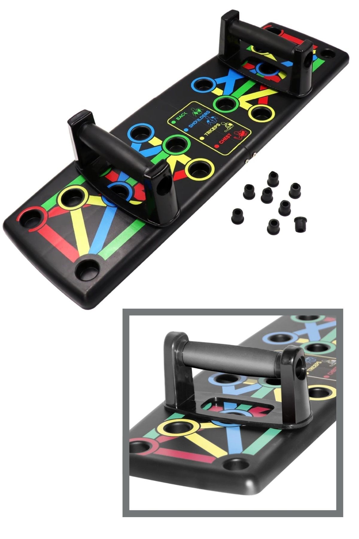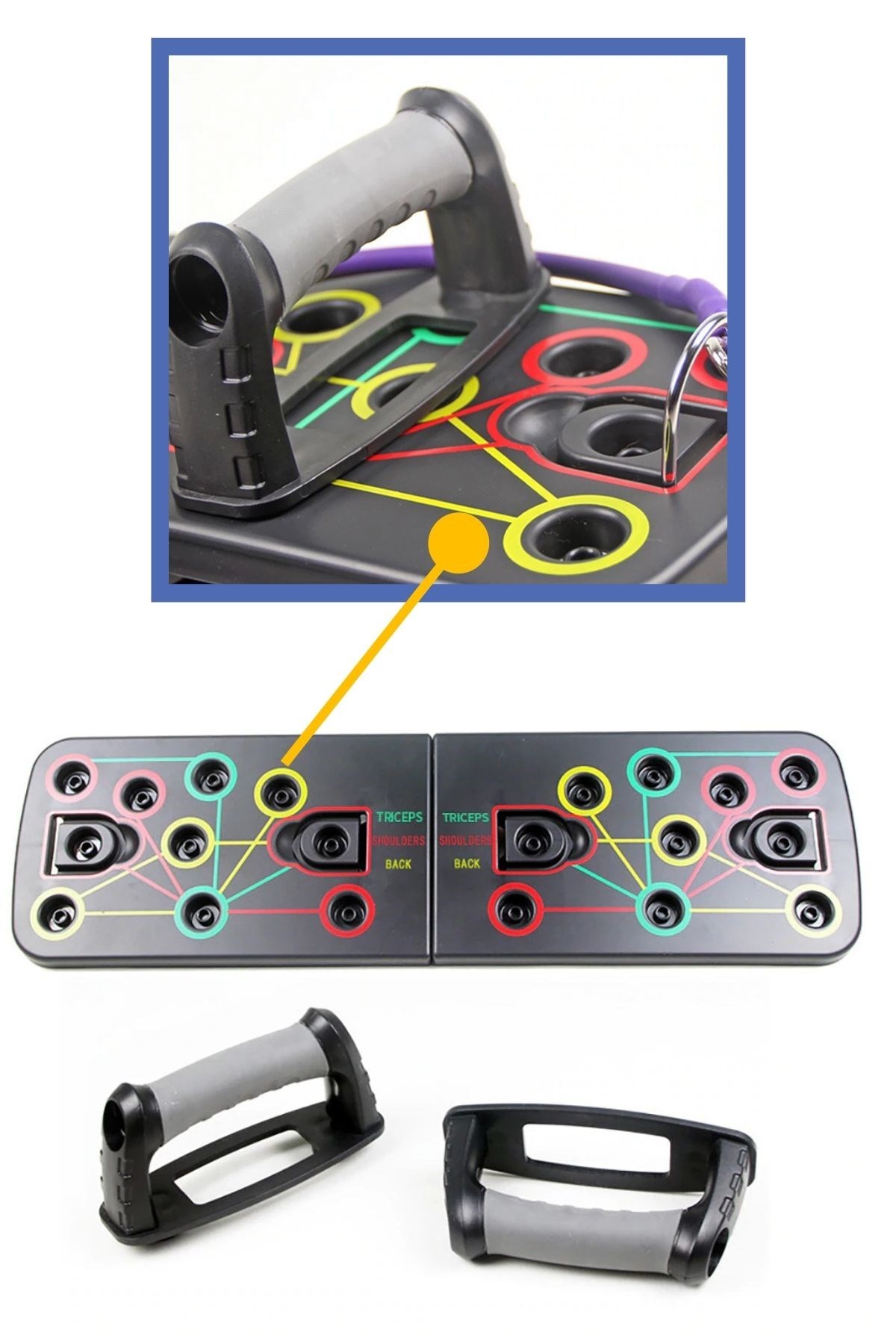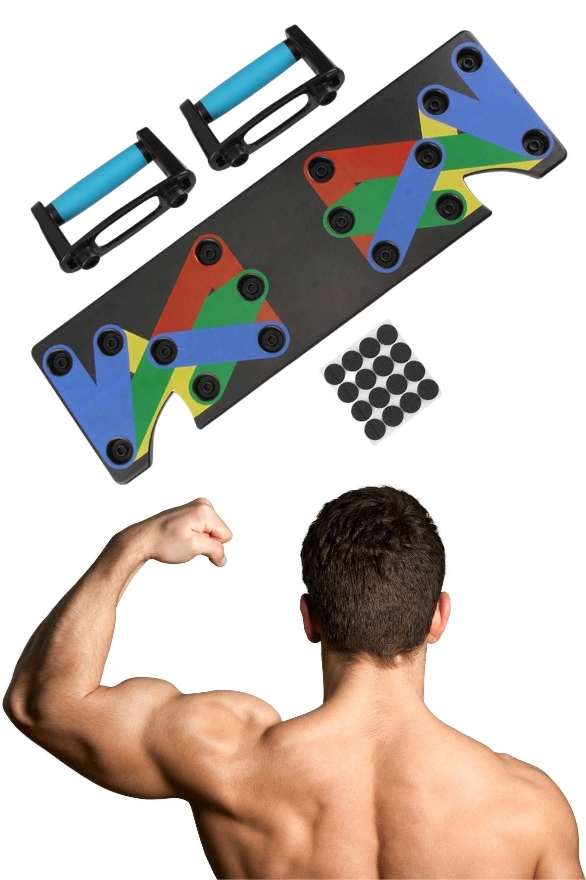 Farklı renk kodlu push up tahtası, kasların çalıştığı özellikleri gösterir (sarı-sırt, mor-göğüs, yeşil-triceps ve kırmızı-omuzlar)