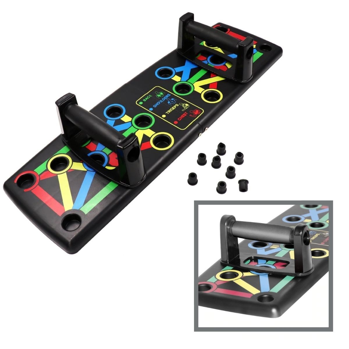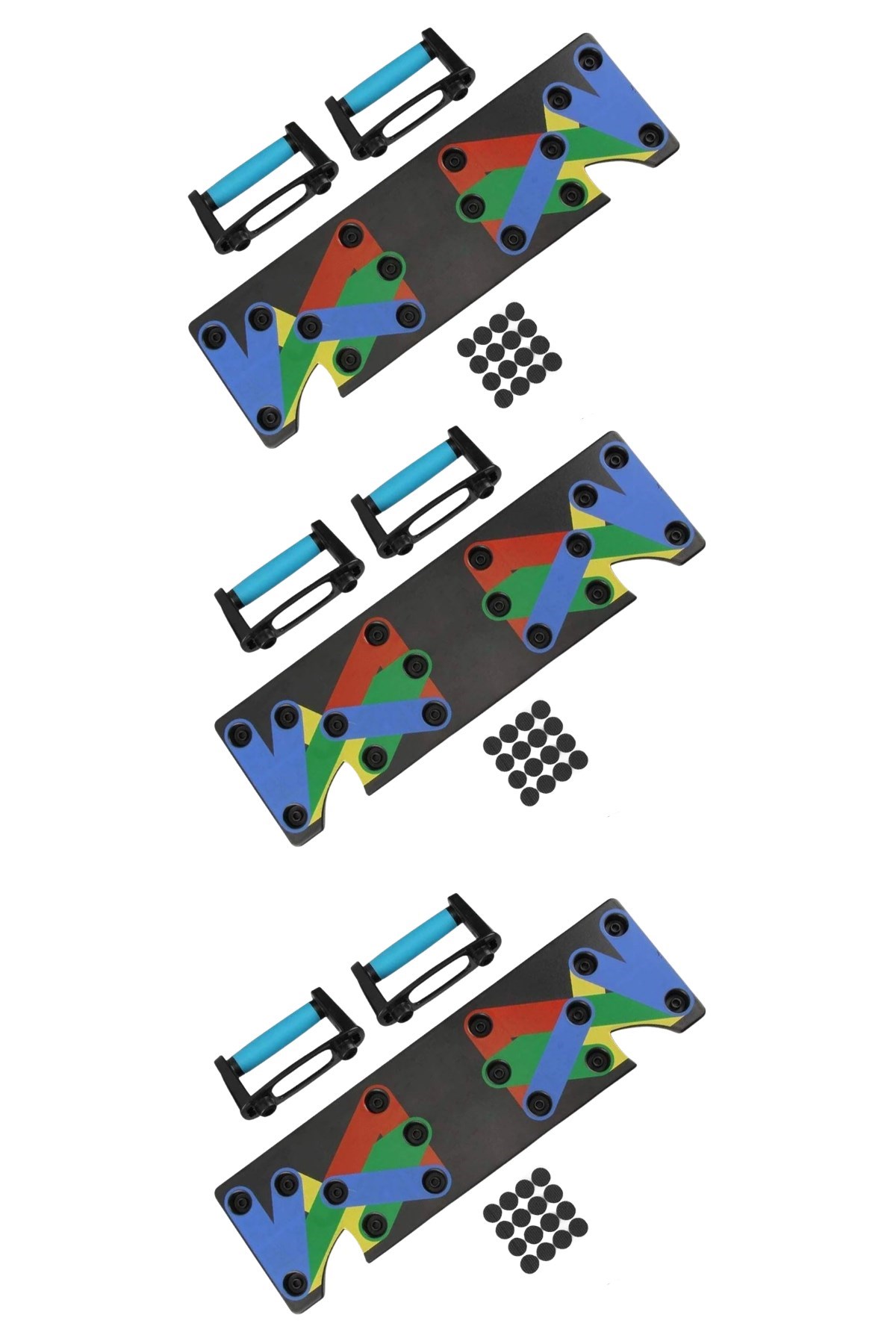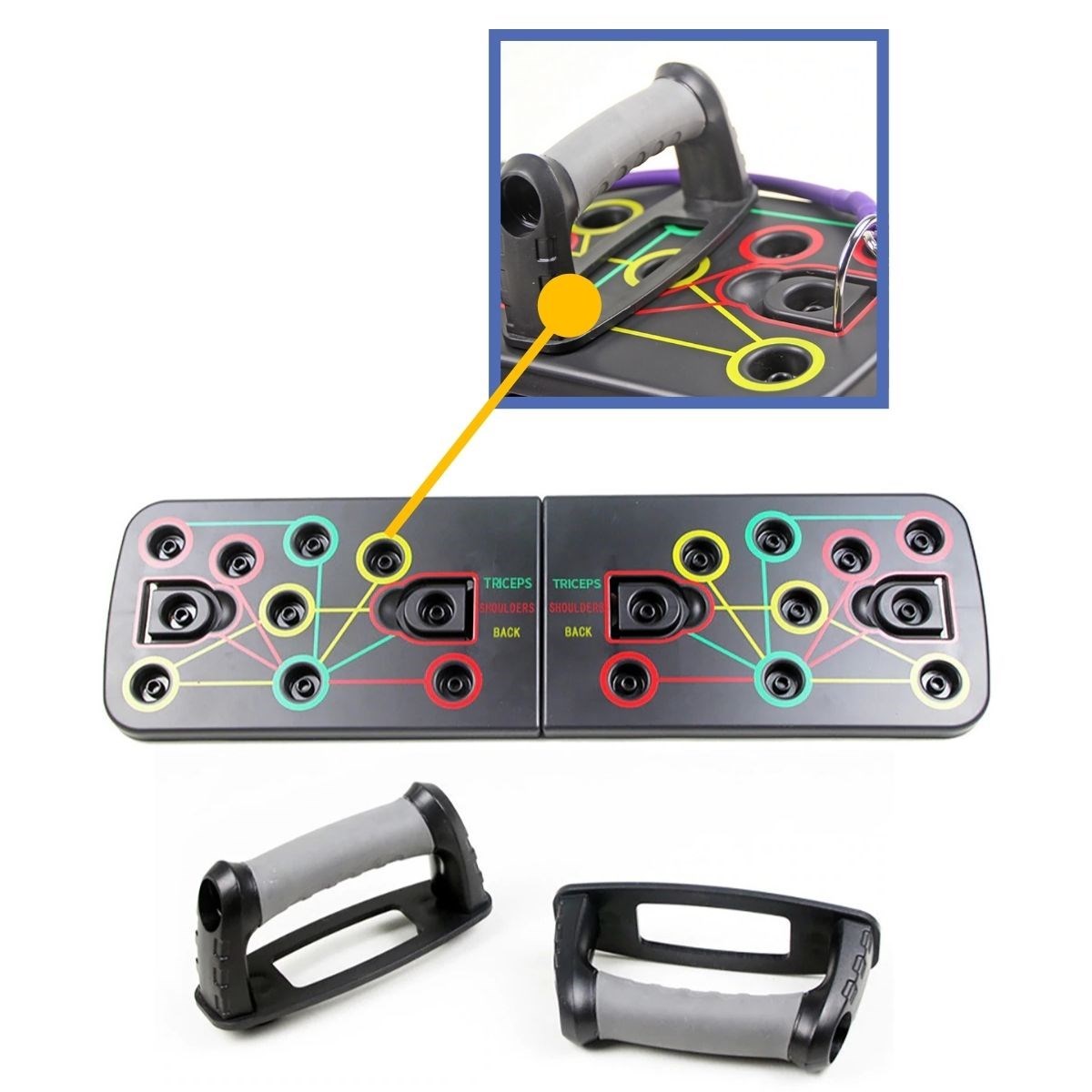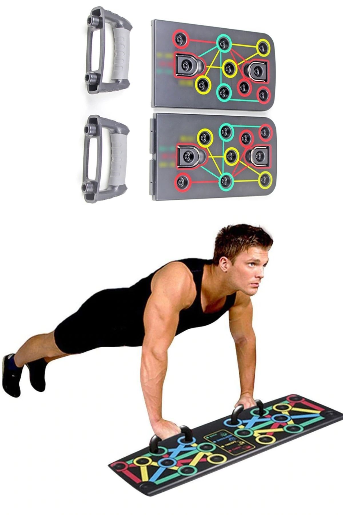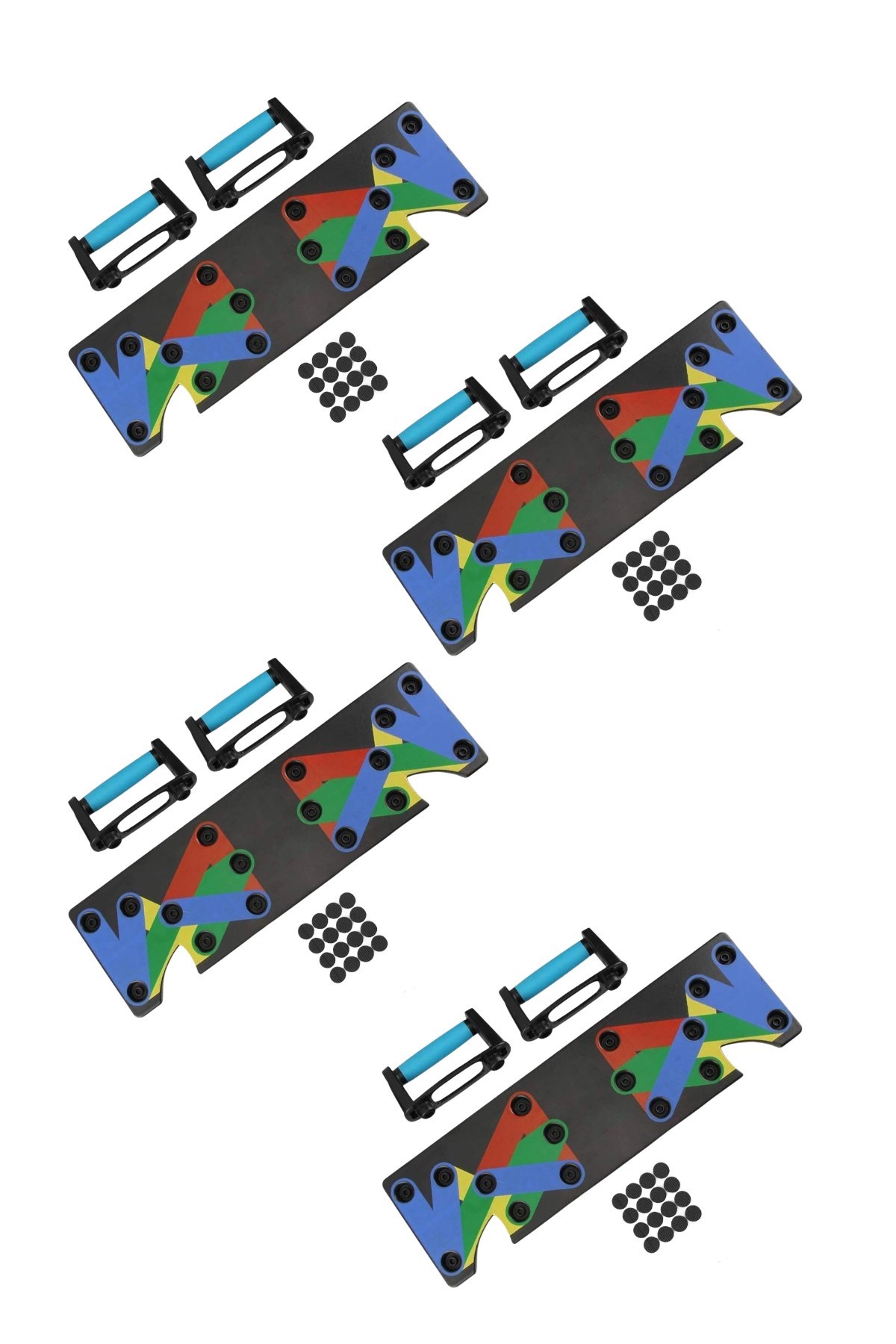 Farklı renk kodlu push up tahtası, kasların çalıştığı özellikleri gösterir (sarı-sırt, mor-göğüs, yeşil-triceps ve kırmızı-omuzlar)