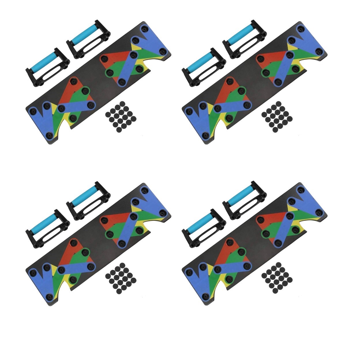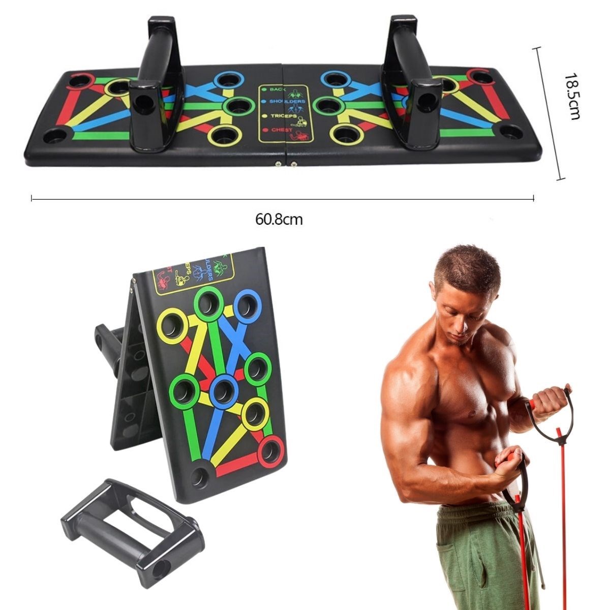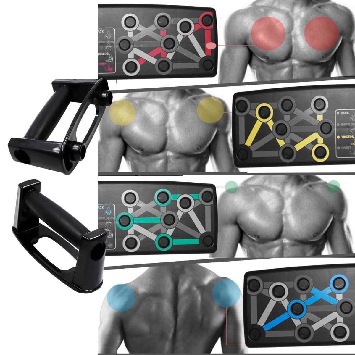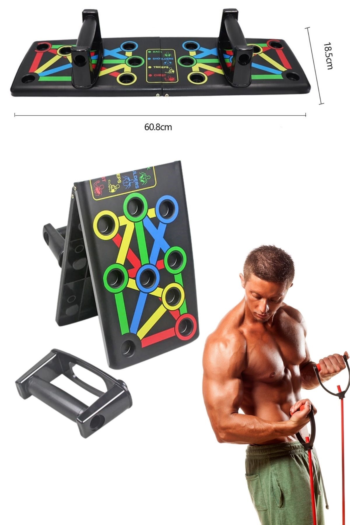 Farklı renk kodlu push up tahtası, kasların çalıştığı özellikleri gösterir (sarı-sırt, mor-göğüs, yeşil-triceps ve kırmızı-omuzlar)