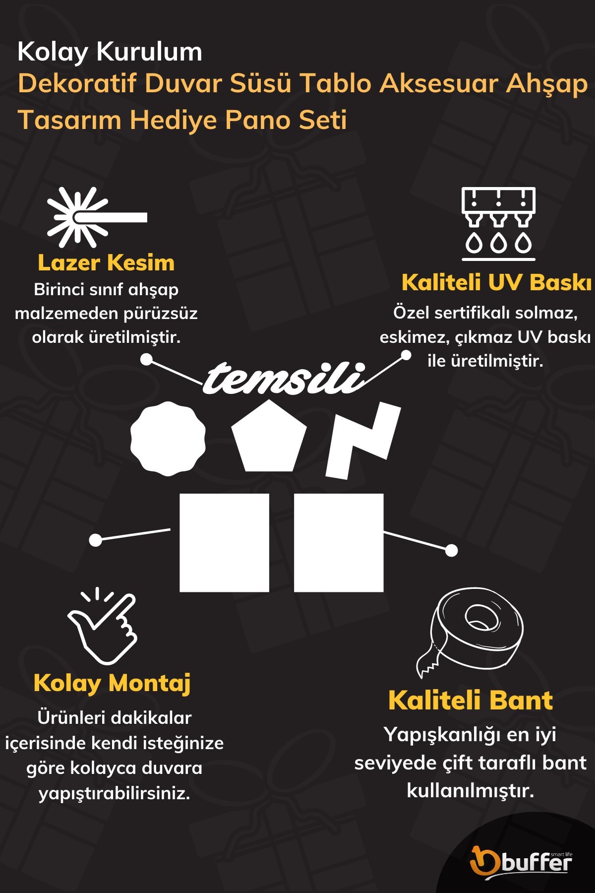 Kullanılan baskı UV baskı teknolojisi ile basılmıştır Diğer ucuz yapıştırmalı ürünlere göre oldukça uzun ömürlüdür Sararma, büzüşme, kavlama gibi durumlar asla söz konusu olmaz