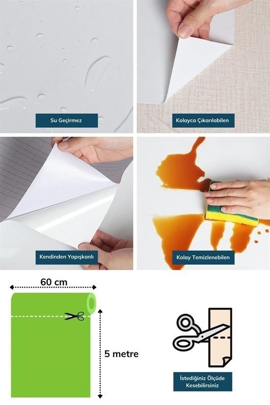 Özellikle duvar kağıdı, masa ve mutfak tezgah yüzeyinde, dolap kapaklarında ve çekmece içlerinde ürünü kullanmanızı tavsiye ederiz