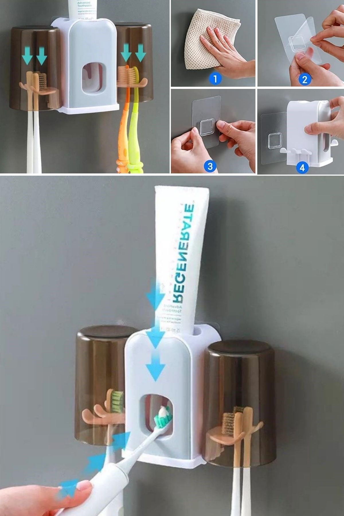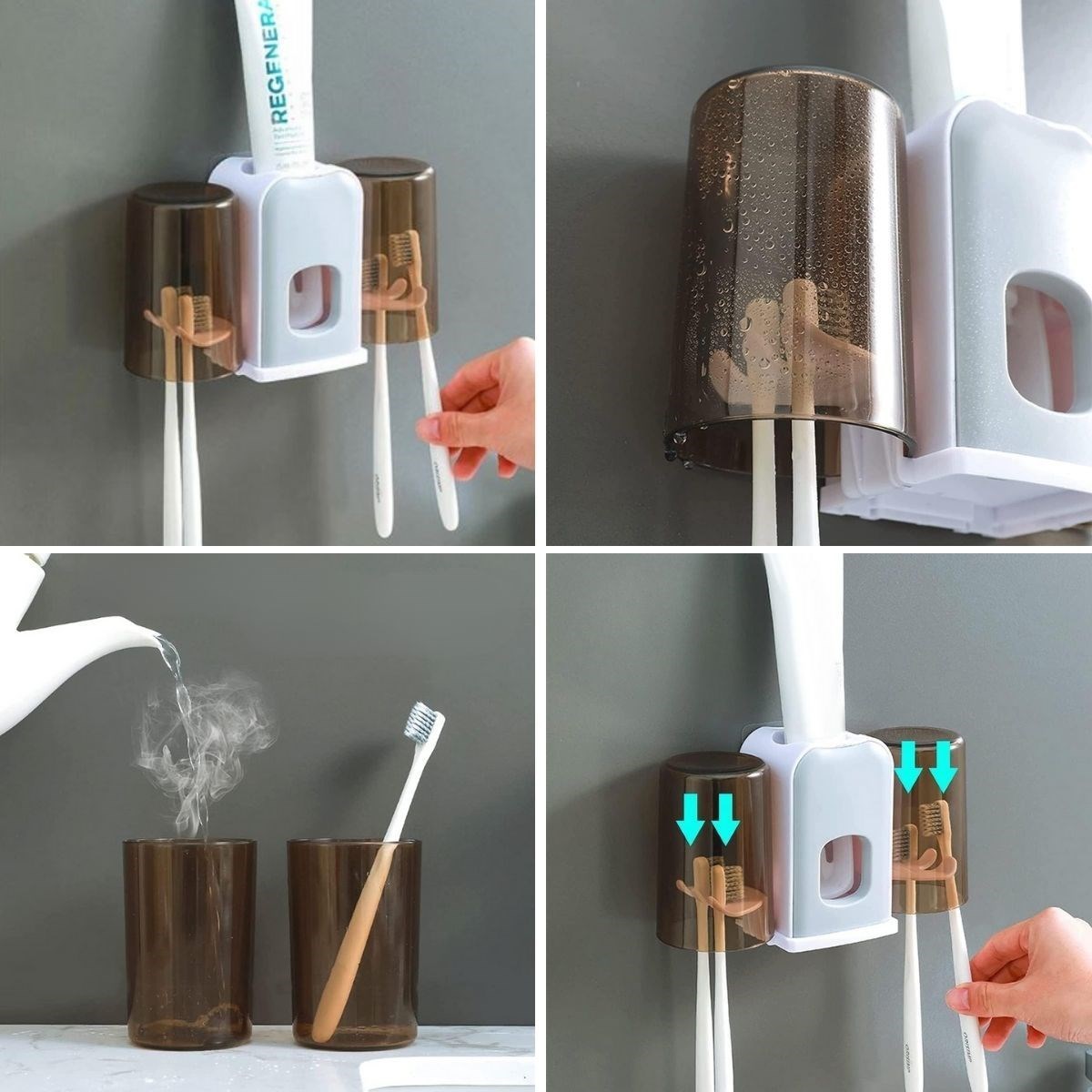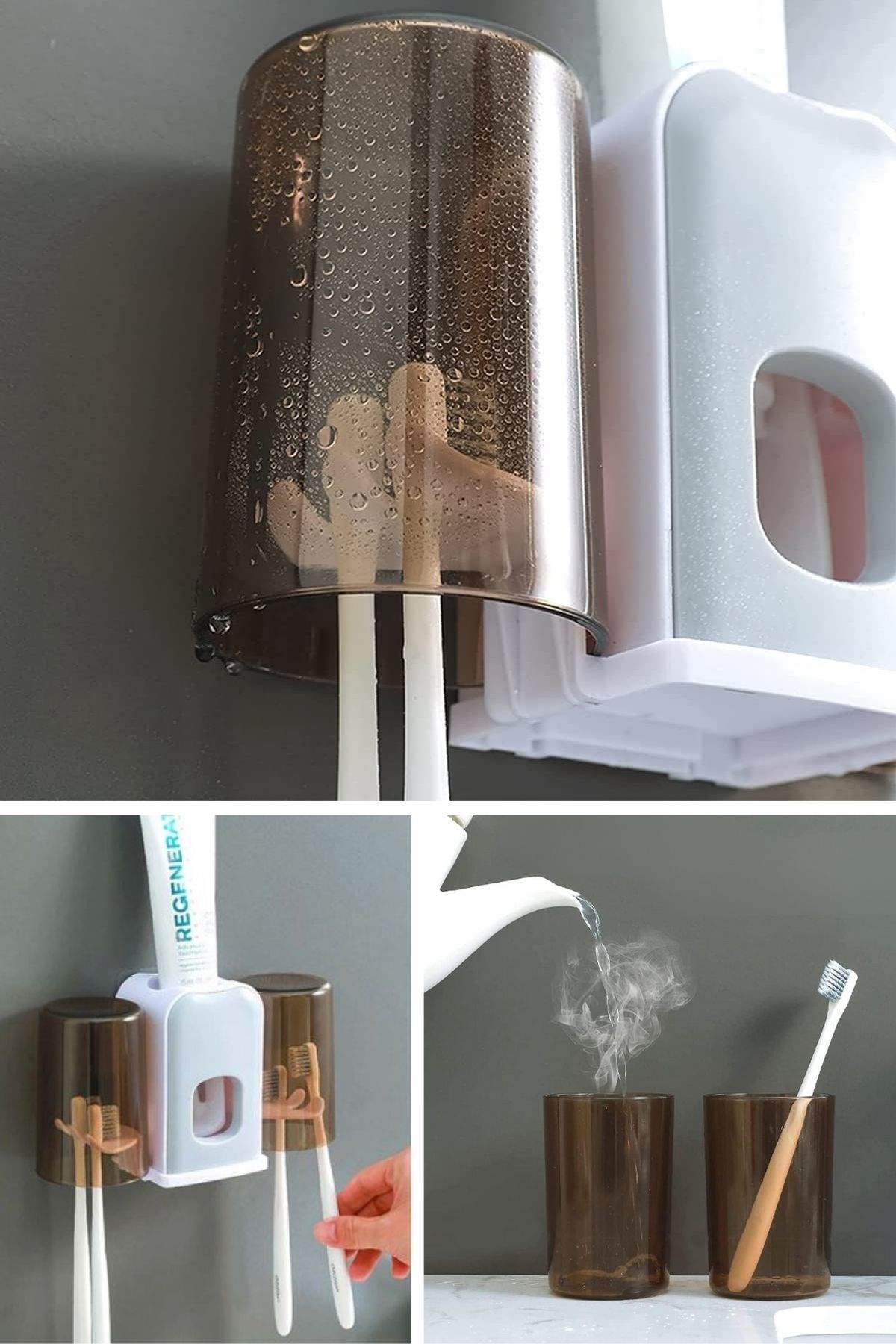 Montaj Gerektirmeyen Fayansa, Duvara Yapışabilen 2 Kupalı Steril Otomatik Diş Macunluk, banyo düzeninizi sağlamak ve diş bakım rutininizi kolaylaştırmak için tasarlanmış pratik ve hijyenik bir üründür. Bu ürün, diş macununu otomatik olarak sıkarak kullanım kolaylığı sağlar ve kupa tutucuları sayesinde diş fırçalarınızı düzenli ve temiz bir şekilde saklar.