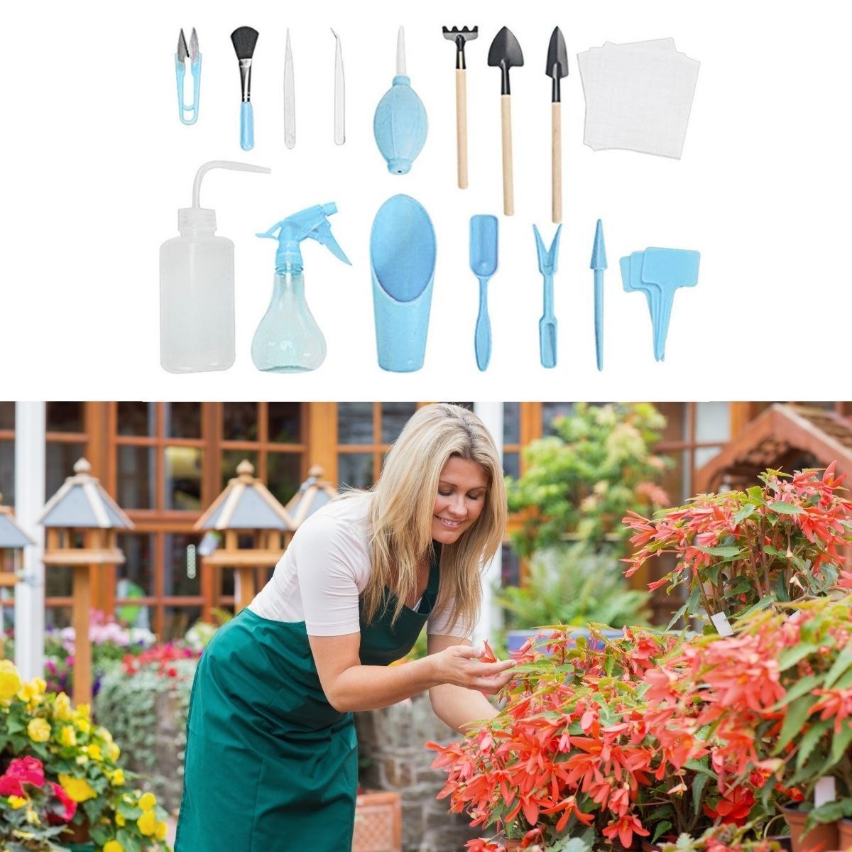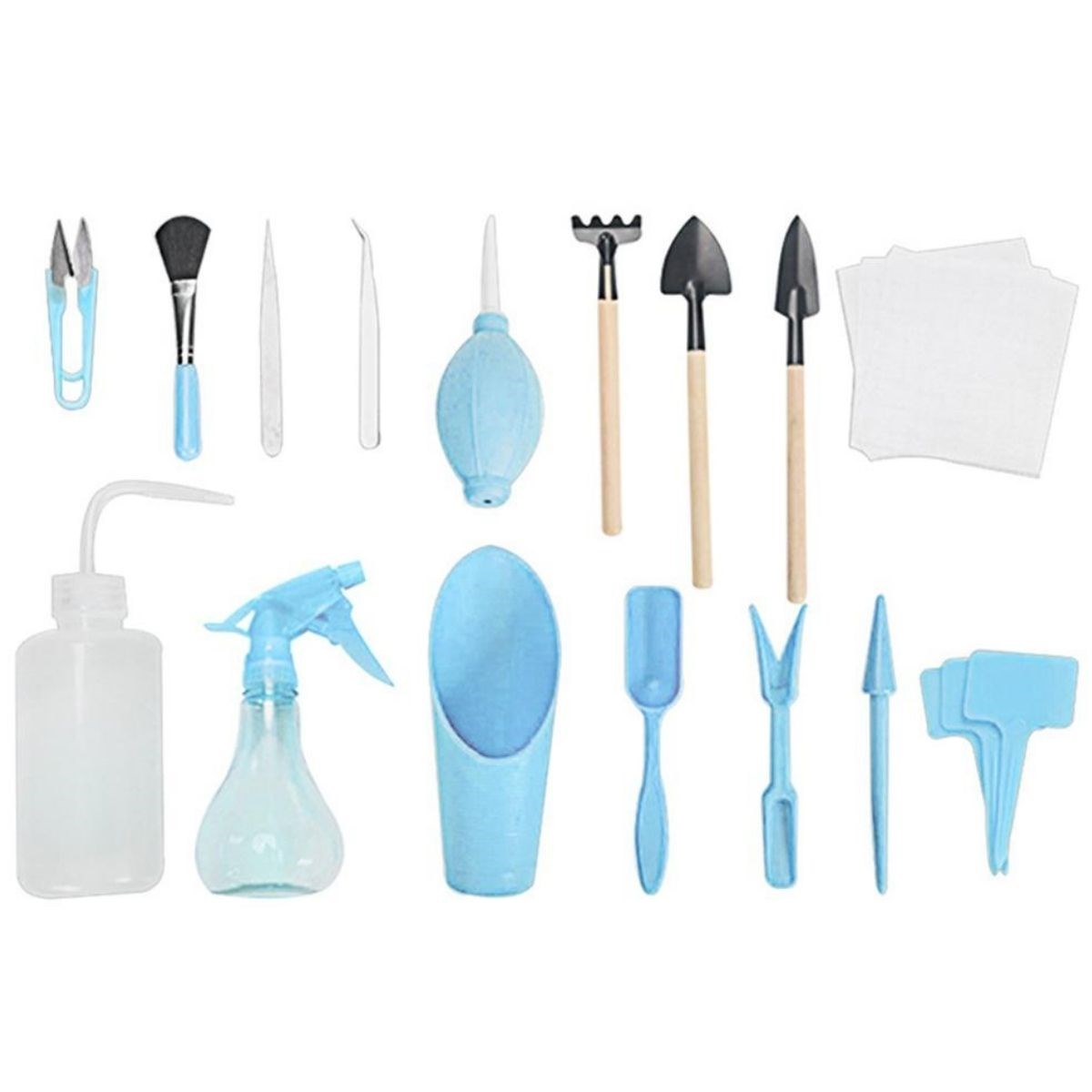 Buffer® 16 Parça Minyatür bahçe aletleri seti Bitki Ekim ve Bakım Seti 16 farklı alet içerir: kavisli ağızlı damlama şişesi, kürek, tırmık, kürek, hava tozu üfleyici, kazma fidesi aleti, delgeç, kepçe, 1 çift kavisli uçlu cımbız, temizleme fırçası, 1 çift küçük makas ve plastik kova kürek