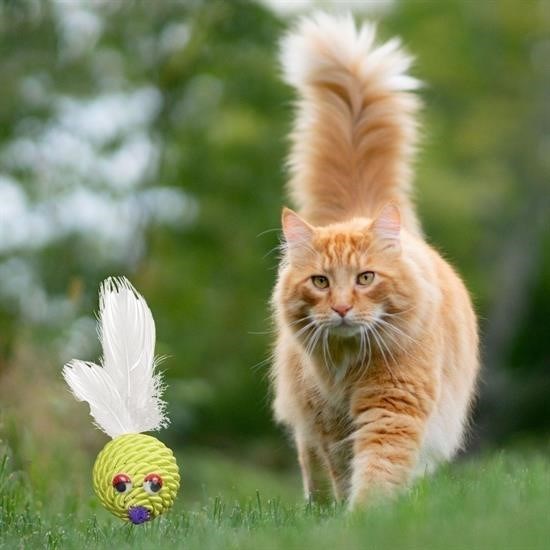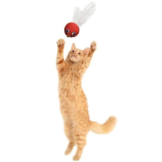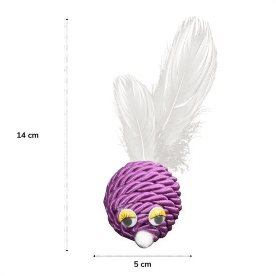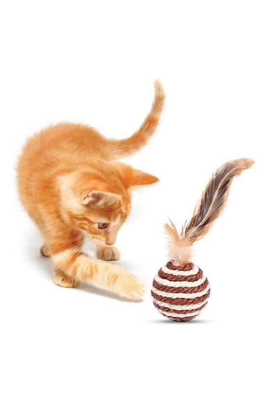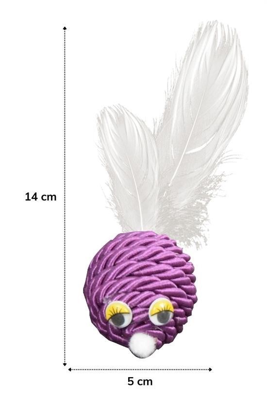 Bu kedi topunun sade bir görünümü var Üzerine bir tüy iliştirilmiş ve deniz yosunu ile kaplıdır Top tırmalayan kedi oyuncağı kedilerin etrafı tırmalamayı ve ısırmayı seven doğası için birebirdir