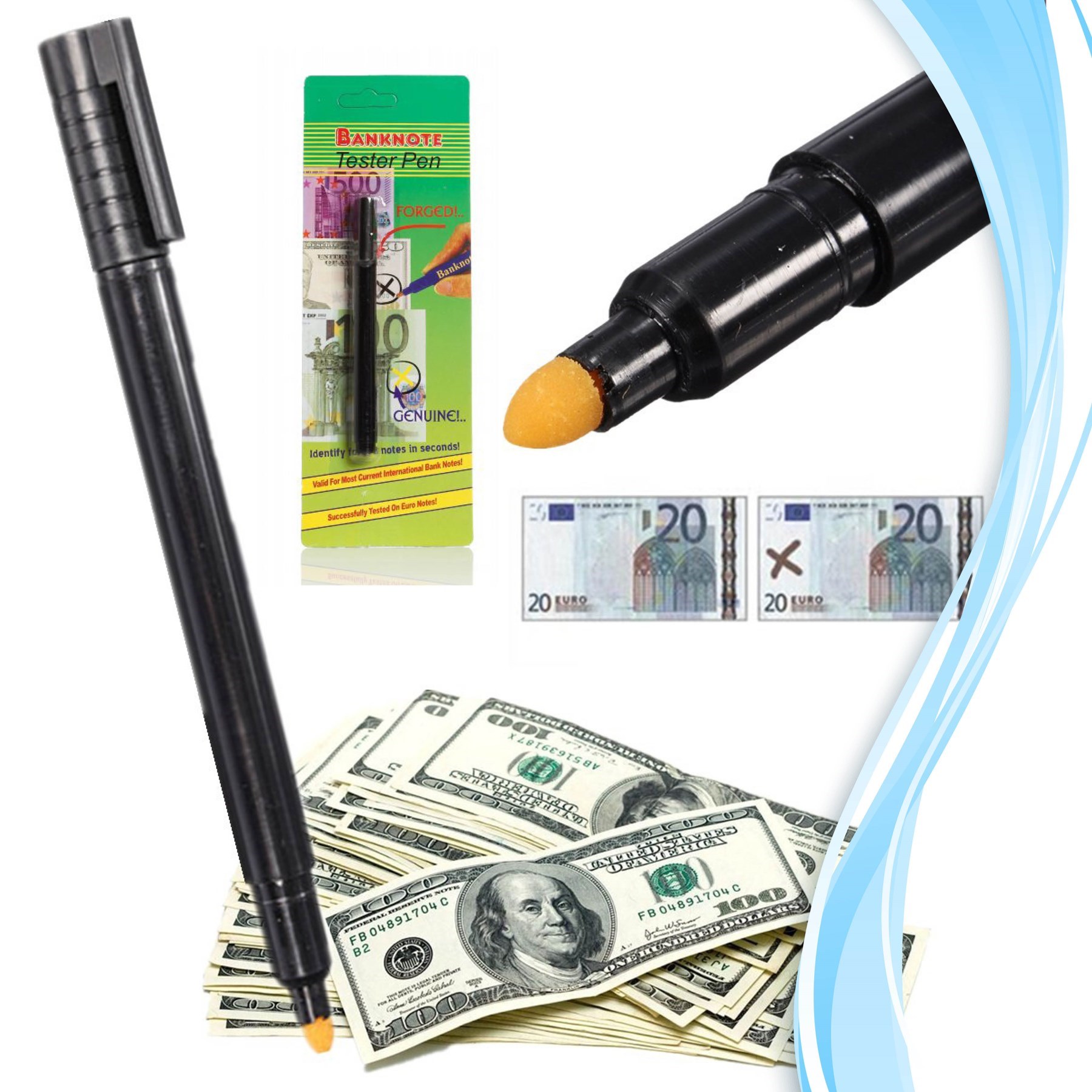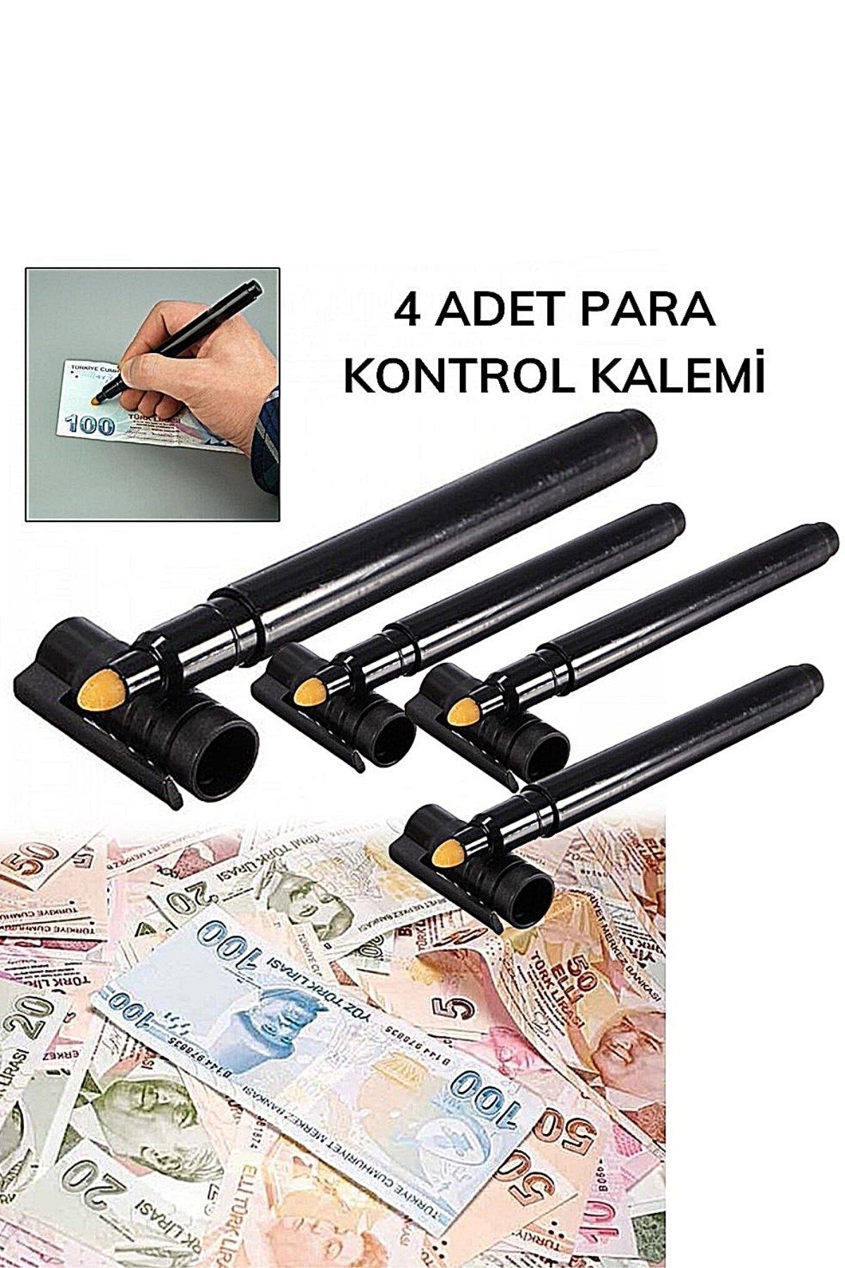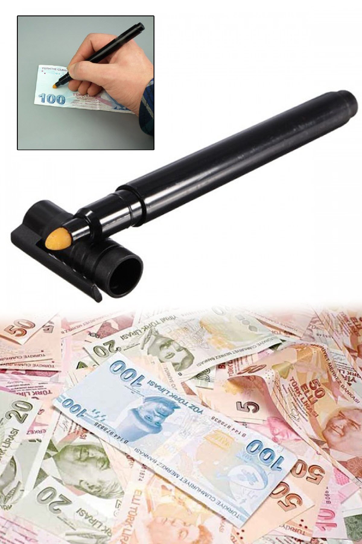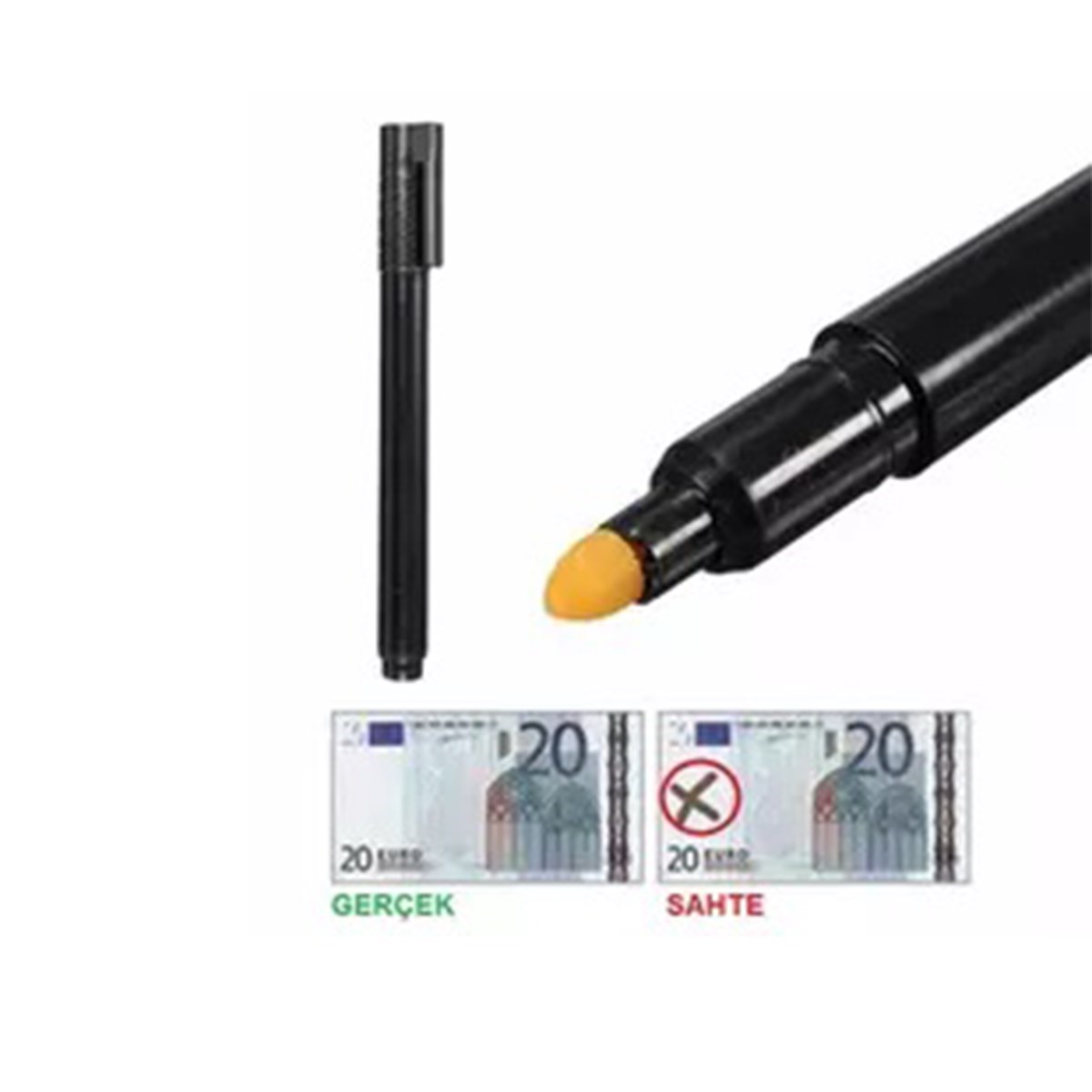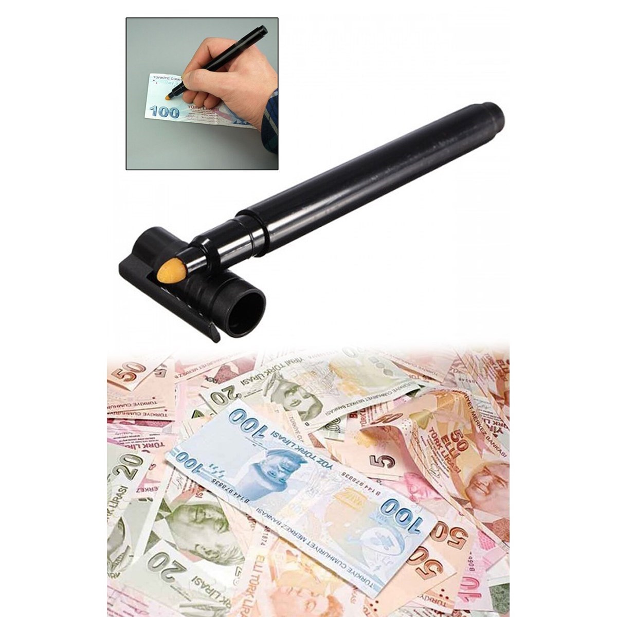 Para Tespit Cihazı Kaleminin içindeki özel mürekkep paranın hakiki veya şüpheli olduğunu hemen belirler Bir yabancı veya Türk Lirasının herhangi bir yerine kısa bir çizgi çektiğinizde onun gerçek olduğunu ayırır