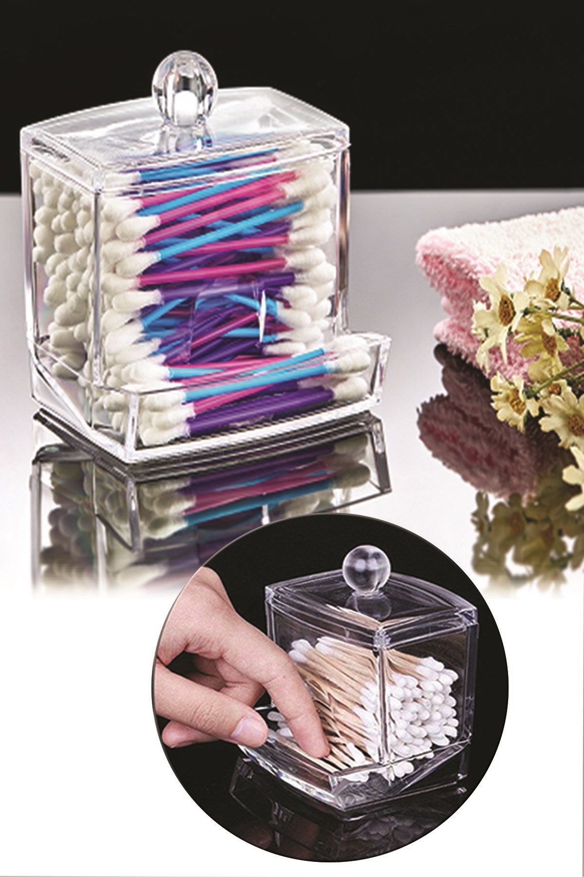 -Şeffaf üstten kapaklı şık tasarım, Altta kulak temizleme çubuklarının alınma bölmesi vardır