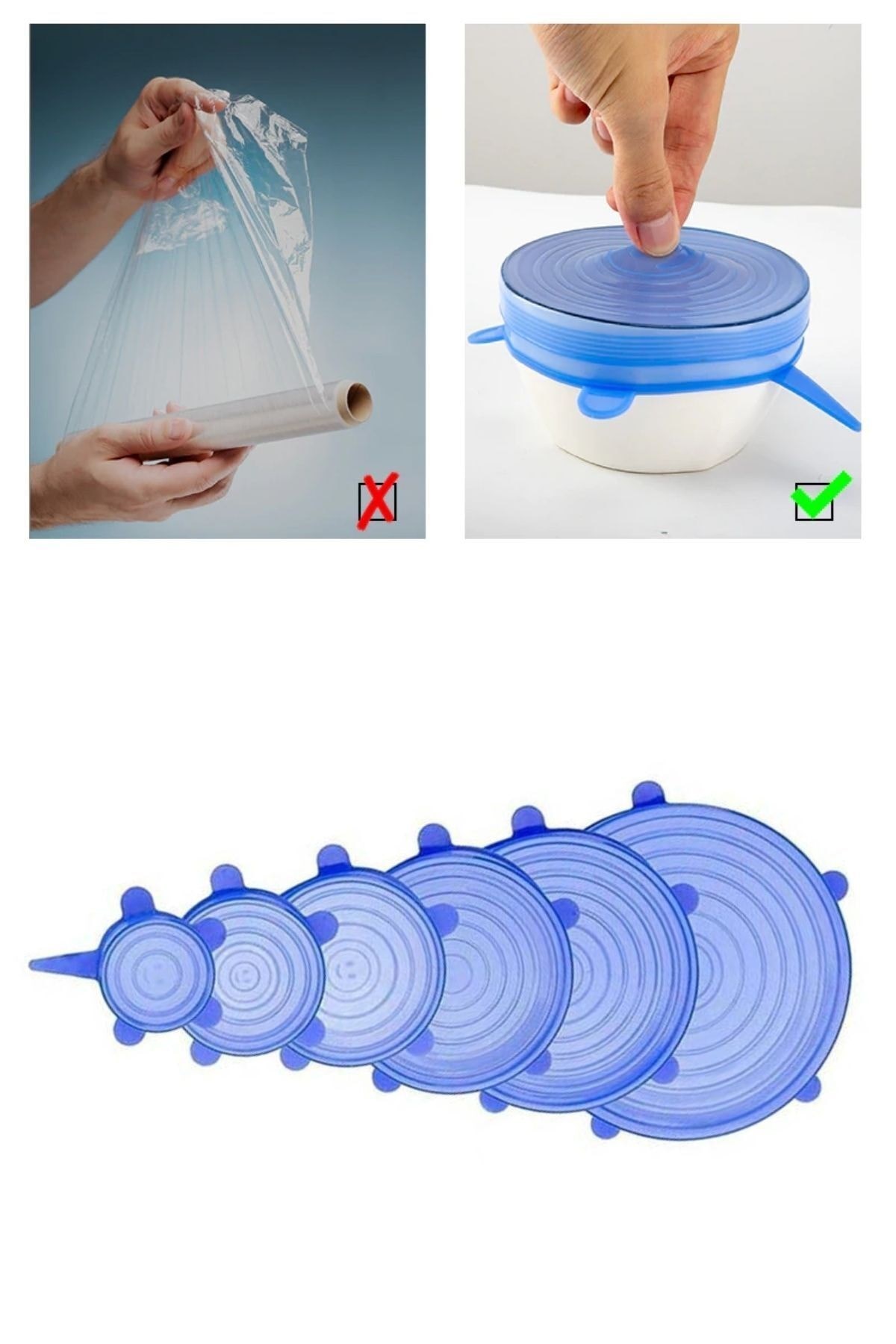 Paket içerisinde 6 farklı boyda silikon kapak bulunmaktadır bu sayede evinizde bulunan bir çok saklama kabı ile uyumlu olacaktır