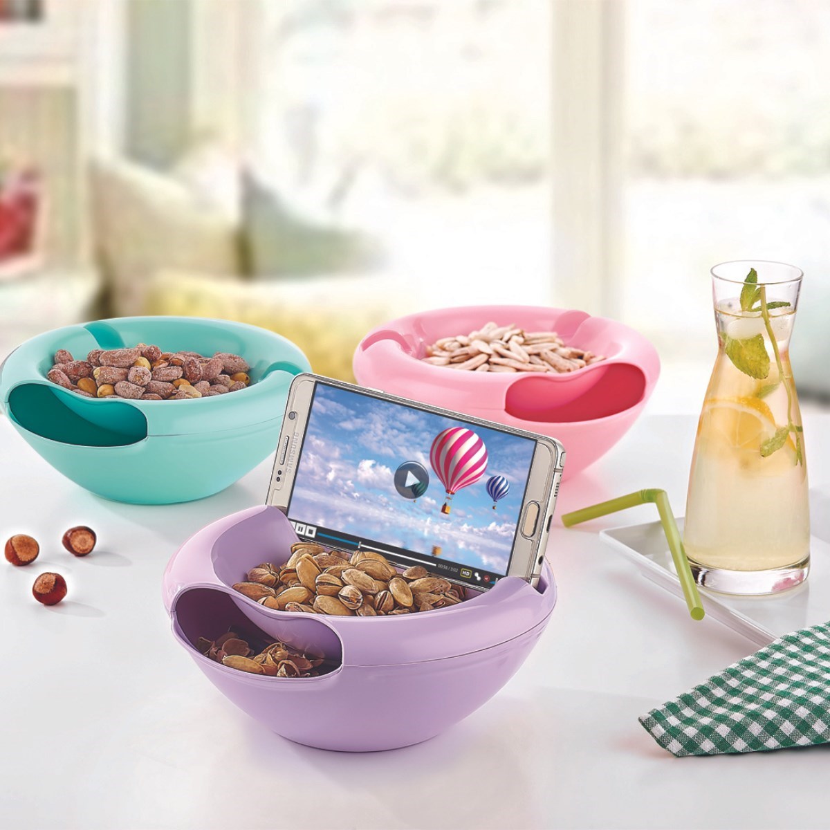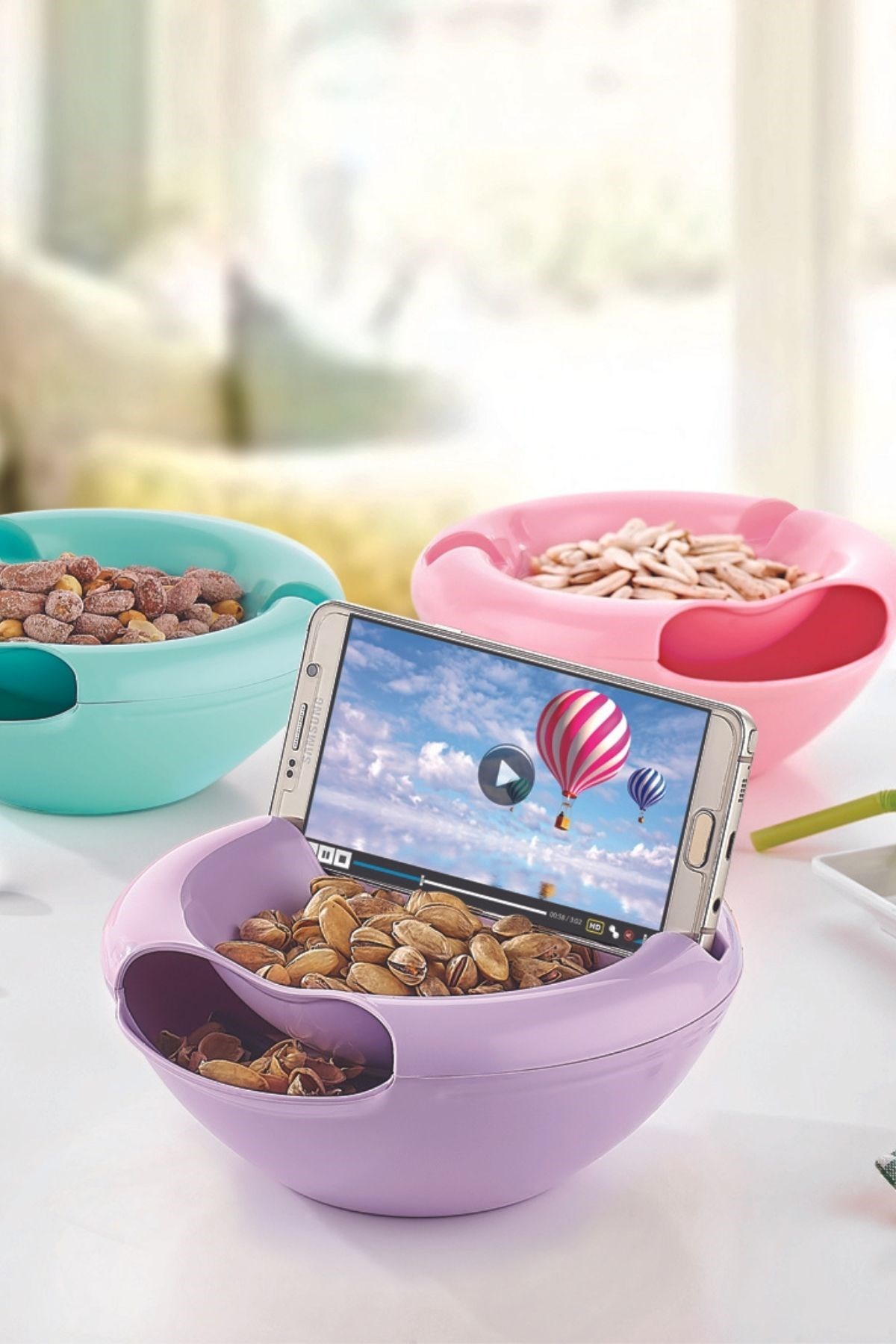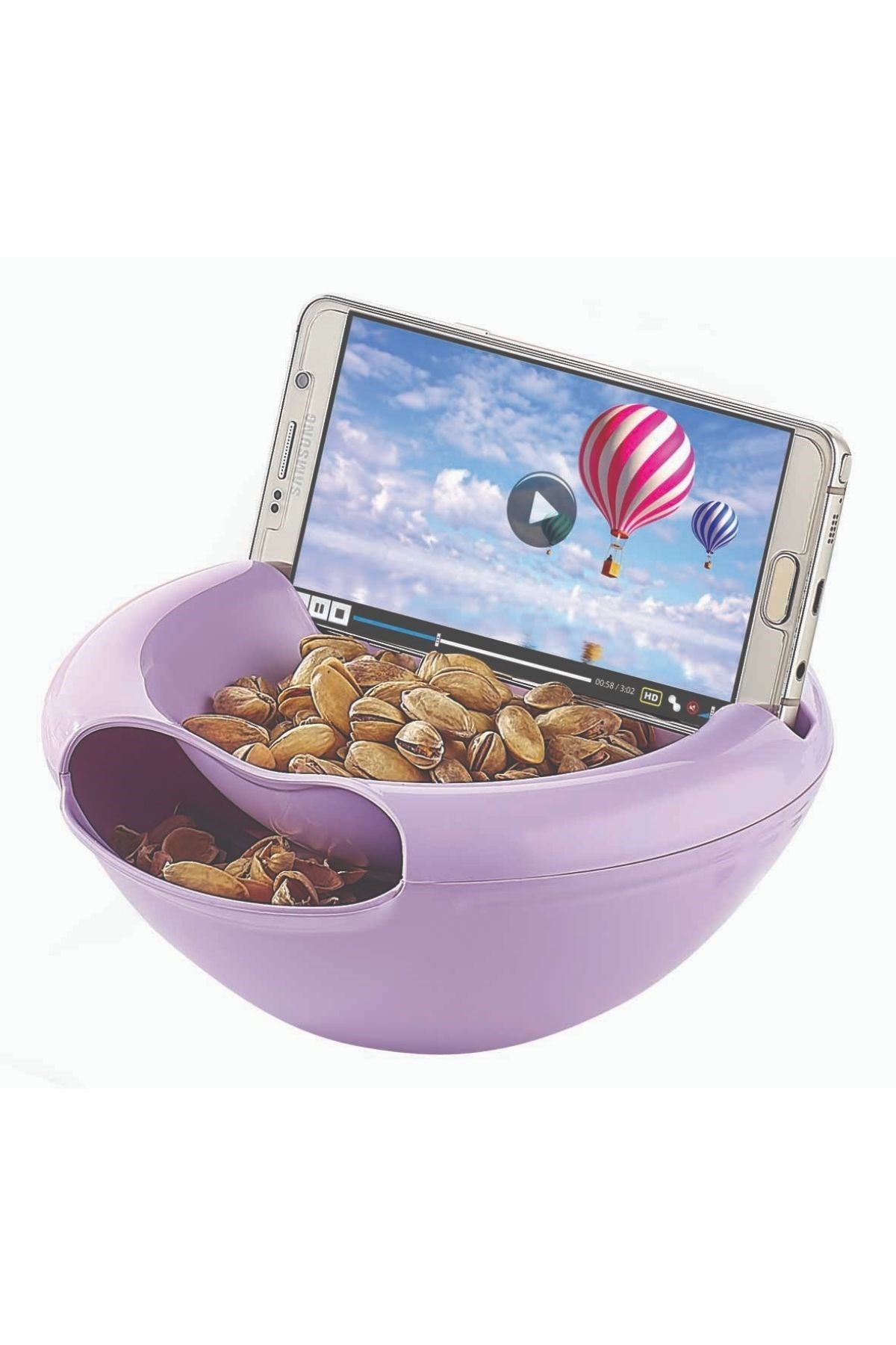 Telefon Standlı Keyif Kasesi, telefonunuzu sabitleyeceğiniz bir bölüme sahip olmakla birlikte yiyeceklerinizi eklemek ve çıkan çöplerinizi atmak için uygun bölmelere sahip bir kasedir