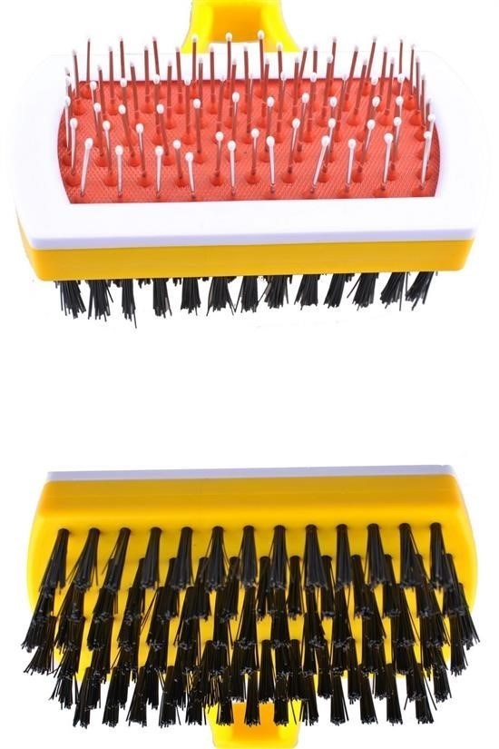 kedi köpek tarama fırçasının gövdesi plastik, tellerinin bir tarafı metalden diğer tarafı plastikten üretilmiştir