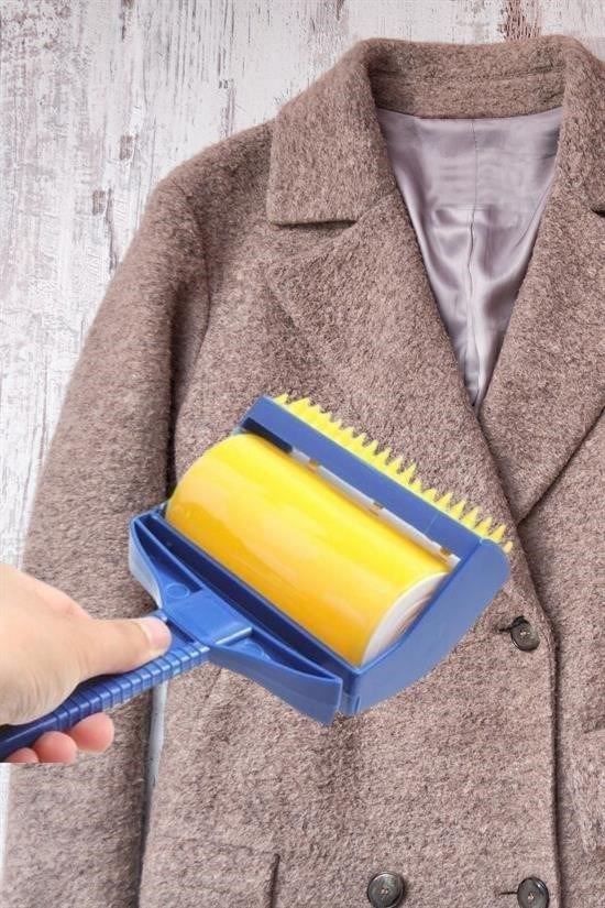 -Daha sonra yapışkanlı silindir tüy toplayıcı yüzey ile üzerinden geçin ve kirlerden kurtulun