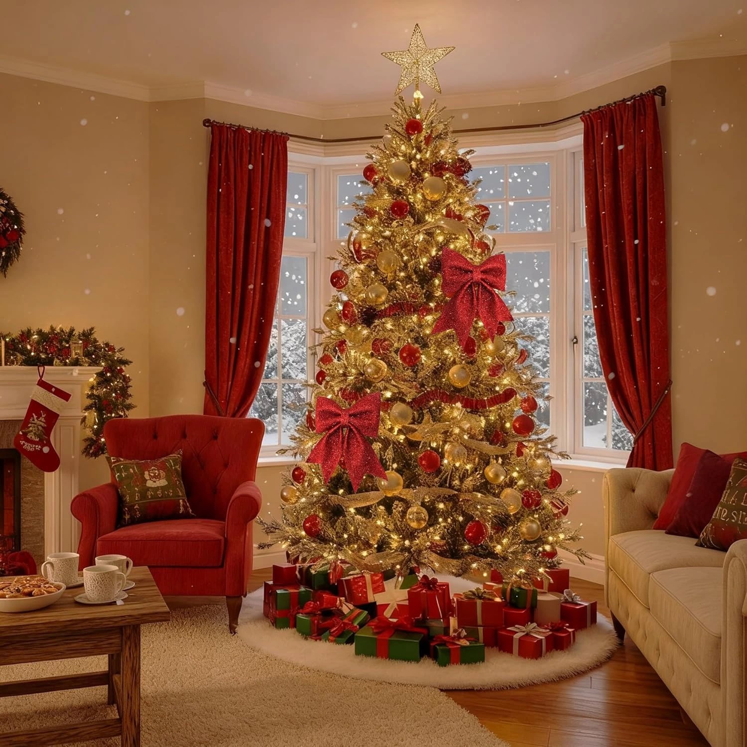 Büyük ve Kaliteli Kırmızı Simli Eva Fiyonk Dekor Yılbaşı Çam Ağacı Süsü 60 X 65cm.