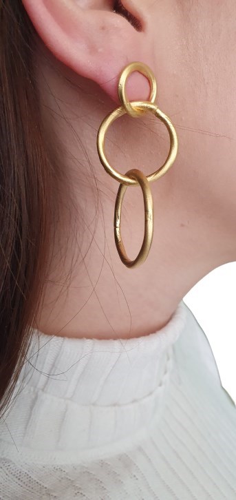 Ürünümüz Gümüş kaplamadan oluşmuştur.Küpe boyu 5 cm'dir Büyükten küçüğe üç halkadan oluşmuştur. Gözalıcı Küpe ile şıklığınızı tamamlayın. Ürünü kimyasal maddelerden uzak tutunuz ve üzerine (parfüm,deodarant vs.).Direkt temasından kaçınınız.