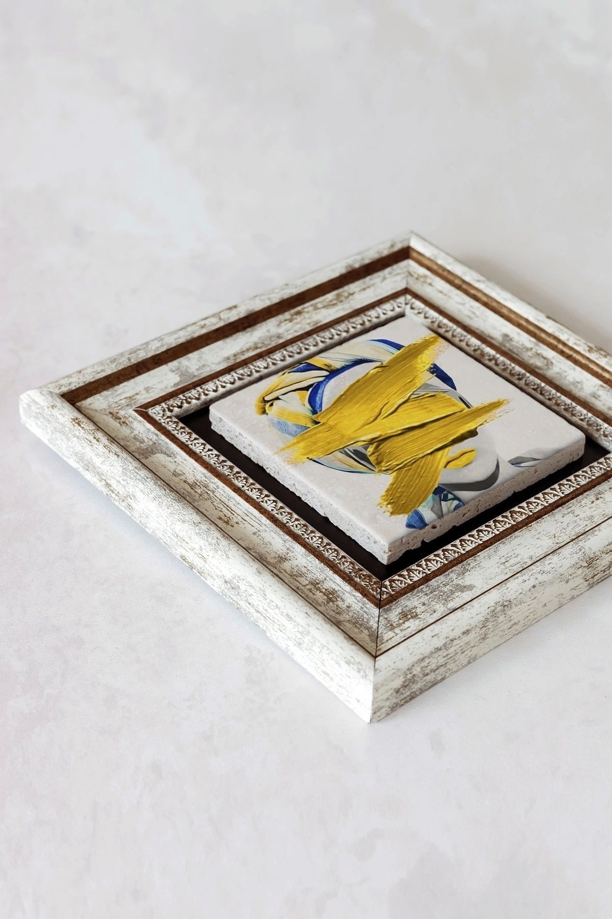 Ürün hakkında: Ölçüleri: 20 cm x 20 cm'dir. ; Kalınlık :2,5 cm'dir. ; Ürünün arka tarafında askı aparatı bulunmaktadır. ; Kullanılan çerçeveler yüksek kaliteli, eskitme görünümlü kompozit malzemeden üretilmiştir. ; Taşların yüzeyindeki baskı teknolojisi özel olup sağlığa hiçbir zararı yoktur. ; Kullanılan malzeme dağdan çıkan gerçek taş oldugu için yüzeyinde belli oranda gözenek bulunması ve renginin krem renginin tonlarını barındırması normaldir kimyasal malzeme teması Yüzey deformasyona maruz kalabilir. ; Nemli bezle silinerek temizlenebilir. ; Isıya, suya ve neme dayanıklıdır. ; Kutu içeriği: Orijinal kutu içerisinde 1 adet çerçeveli taş duvar dekoru. ; 1 adet çerçeveli duvar dekoru ağırlığı: 250 gr çerçeve askısı ile duvara montajı yapılabilir.;