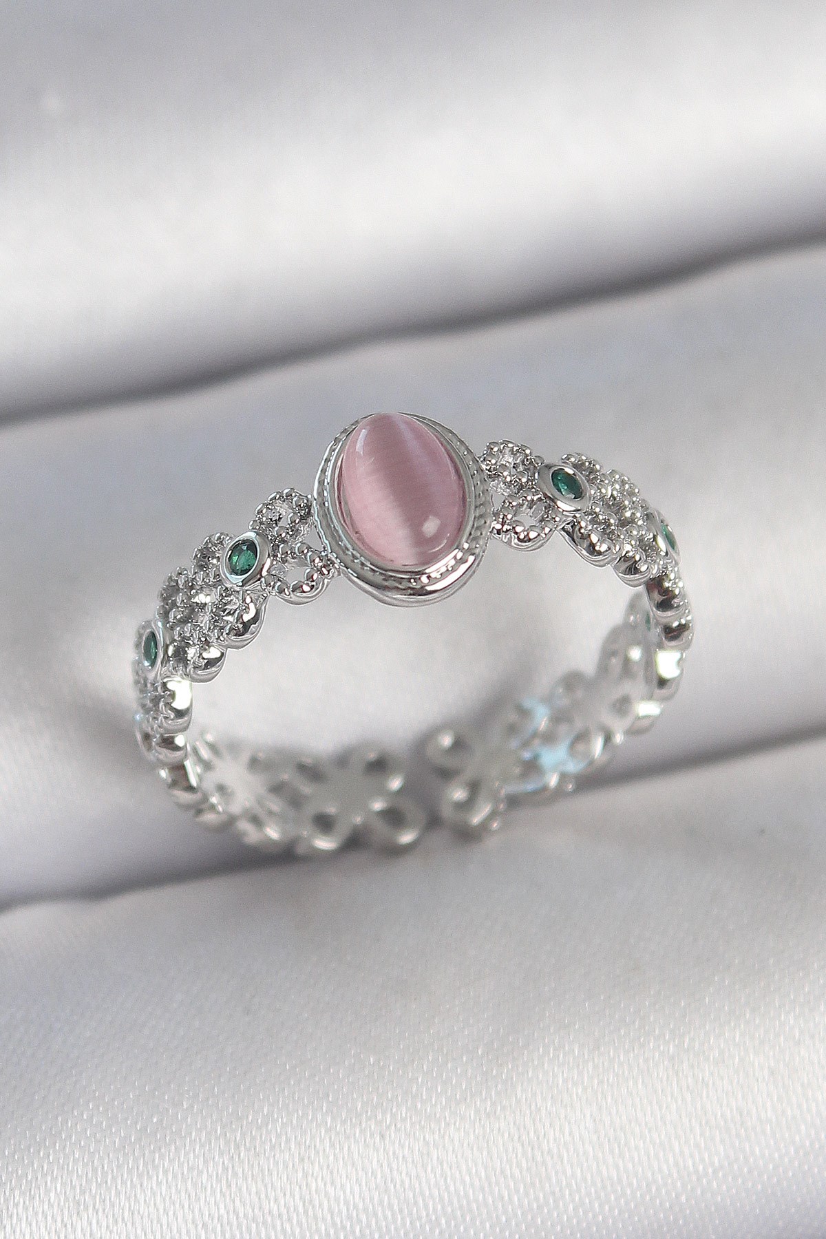 Pirinç Gümüş Renk Zirkon Taş Detaylı Pembe Mineli Damla Model Ayarlanabilir Kadın Yüzük