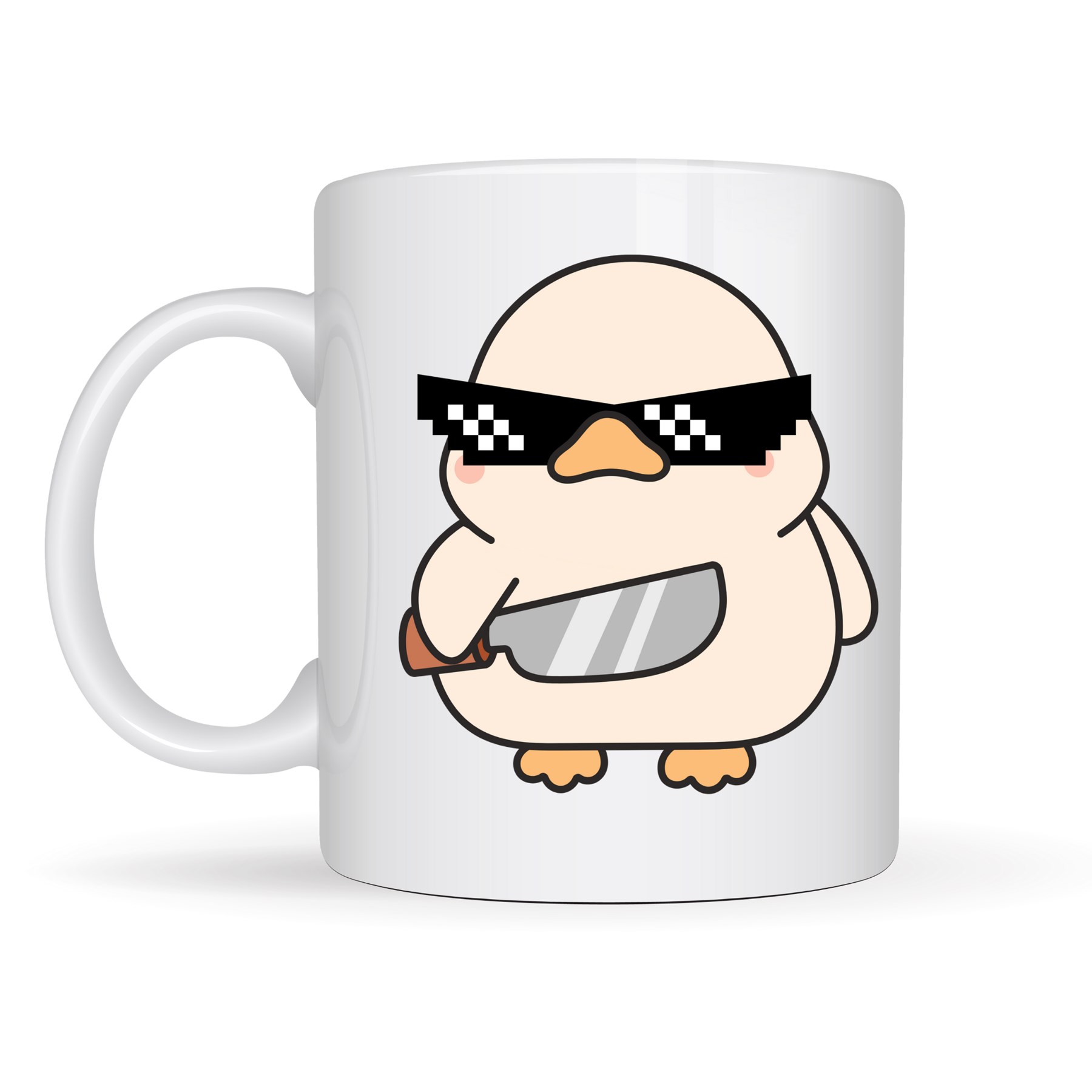 Bu sevimli ama bir o kadar da cool ördek tasarımlı porselen kupa, üzerinde yer alan “deal with it” tarzı gözlükleri ve elindeki bıçak detayıyla tam anlamıyla “ben buradayım” diyor!