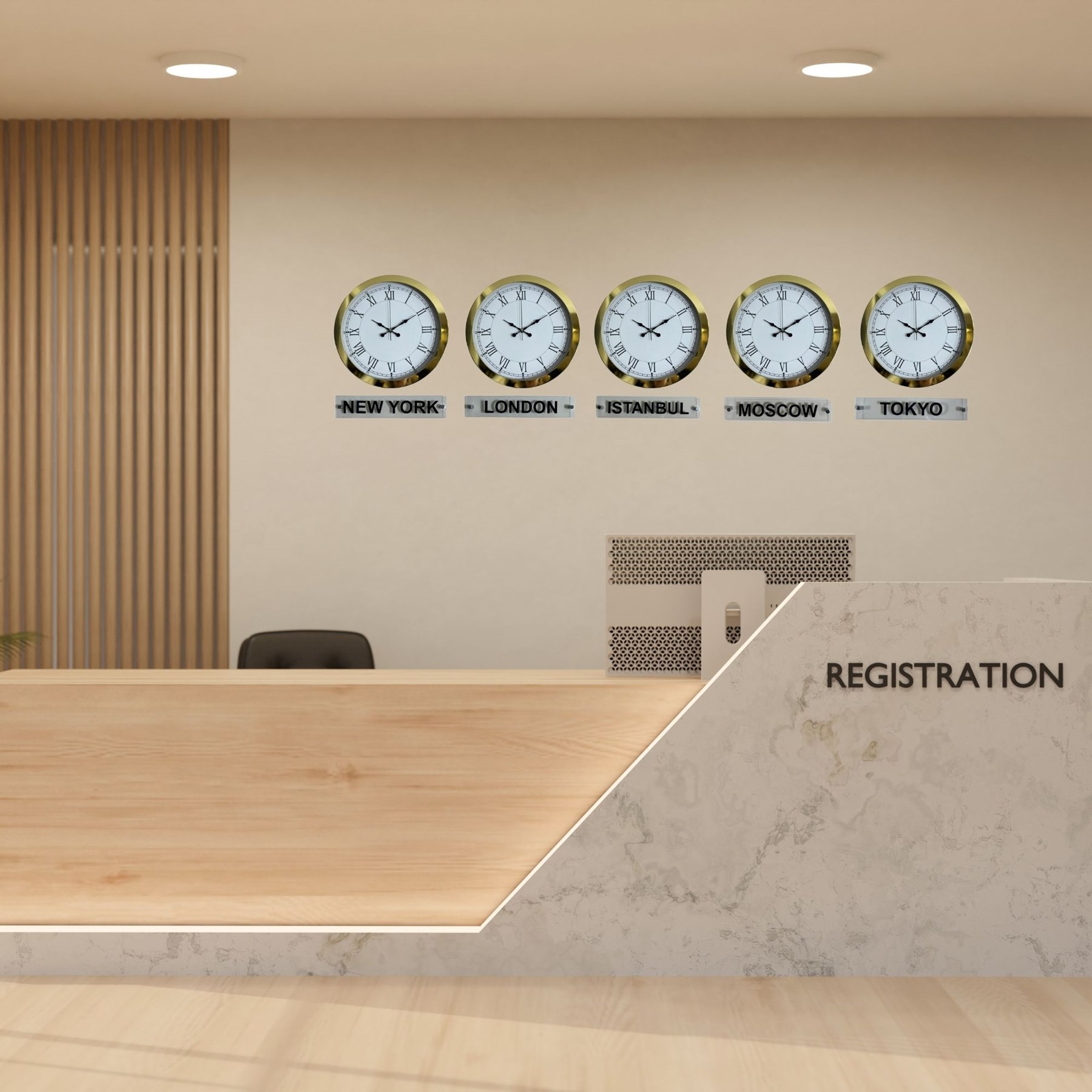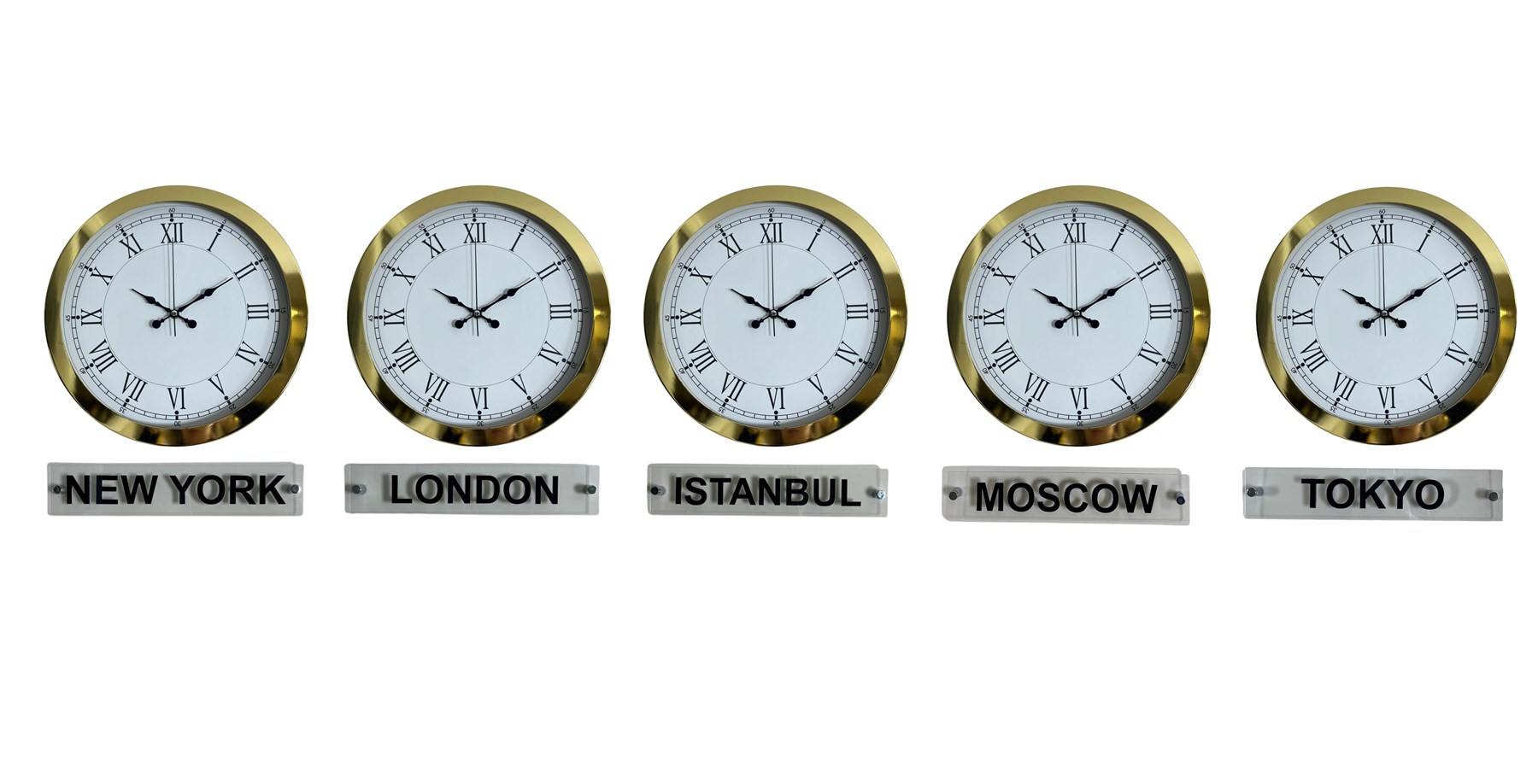 Farklı şehirlerin saat dilimlerini aynı anda takip etmenizi sağlayan bu özel set; New York, London, Istanbul, Moscow ve Tokyo saatlerini tek bir alanda sunar. Alt kısmında yer alan şeffaf tabelalar ürüne kurumsal ve global bir kimlik kazandırarak özellikle otel, ofis ve resepsiyon alanlarında dikkat çekici bir görünüm oluşturur.