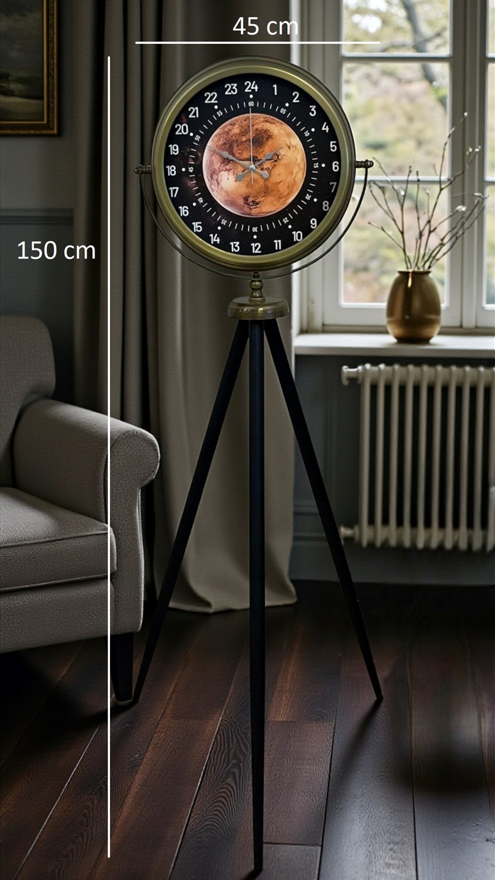 Eskitme metal çerçevesi ve tripod ayak yapısı, endüstriyel ve vintage tarzı modern çizgilerle birleştirir. Siyah metal tripod ayaklar, saatin hem sağlam hem de dengeli durmasını sağlarken mekânda heykelsi bir duruş sergiler. Saat başlığının ayarlanabilir askı sistemi sayesinde açı verilebilir yapıda olması kullanım konforunu artırır.