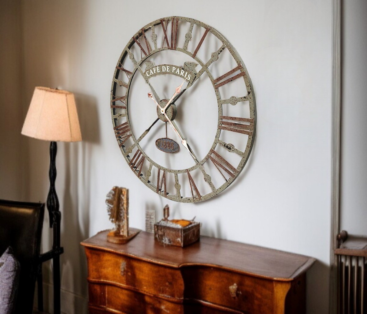 Roma rakamlı çerçevesi, klasik saat estetiğini güçlü bir biçimde ortaya koyarken; metal gövdesi ve özenle hazırlanmış eskitme yüzeyi sayesinde her bakışta farklı bir detay sunar. Büyük boy yapısı sayesinde yalnızca zamanı göstermekle kalmaz, bulunduğu ortamda ilk bakışta fark edilen bir odak noktası haline gelir.