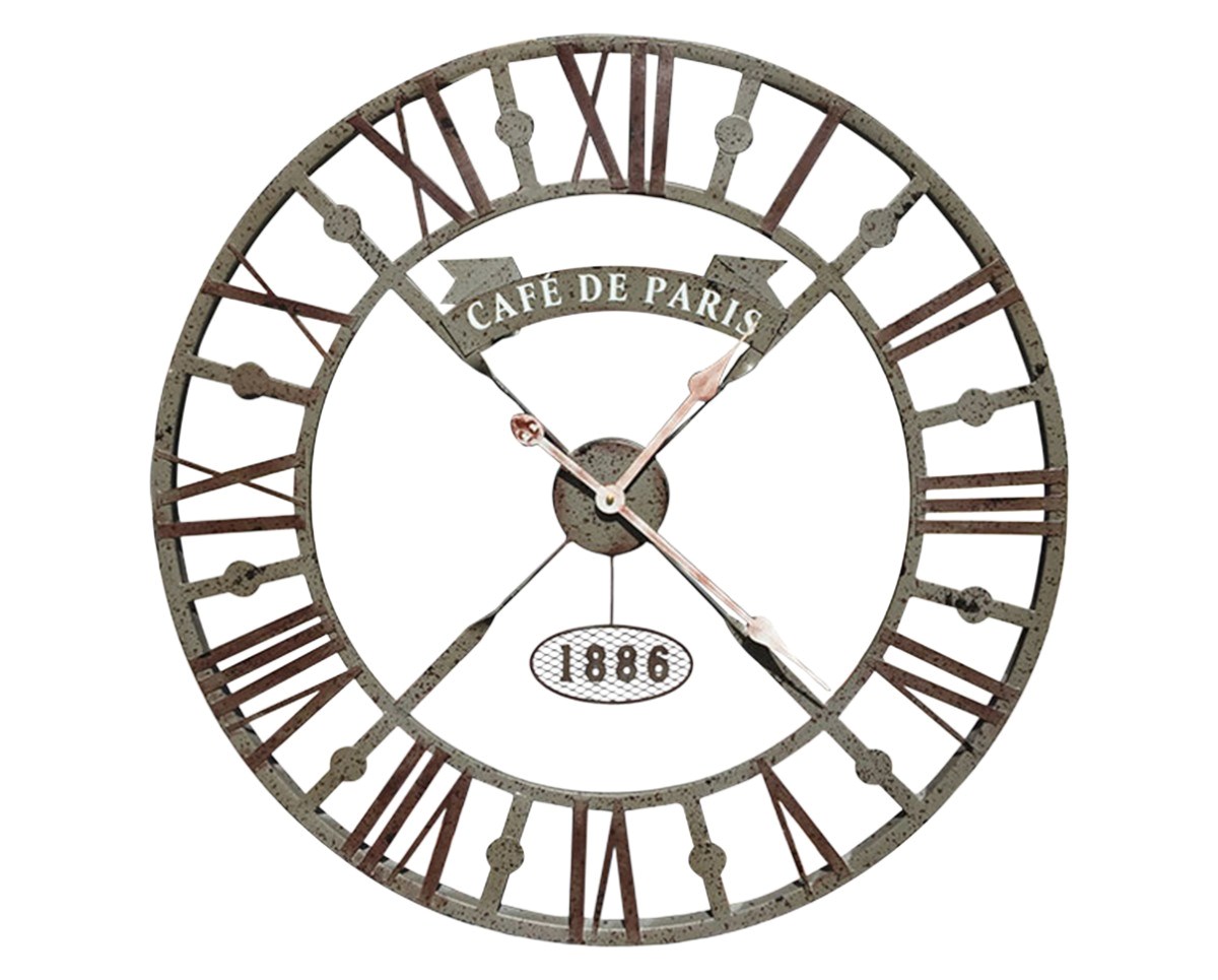 73 cm geniş çapı, Cafe de Paris yazı detayı ve 1886 vurgusuyla dikkat çeken bu özel tasarım duvar saati; klasik Avrupa kafe kültürünün nostaljik ruhunu modern yaşam alanlarına taşıyan benzersiz bir dekoratif objedir. Eskitme metal dokusu sayesinde geçmişin zarafetini yansıtırken, açık kadran (iskelet) yapısıyla mekâna derinlik ve karakter kazandırır.