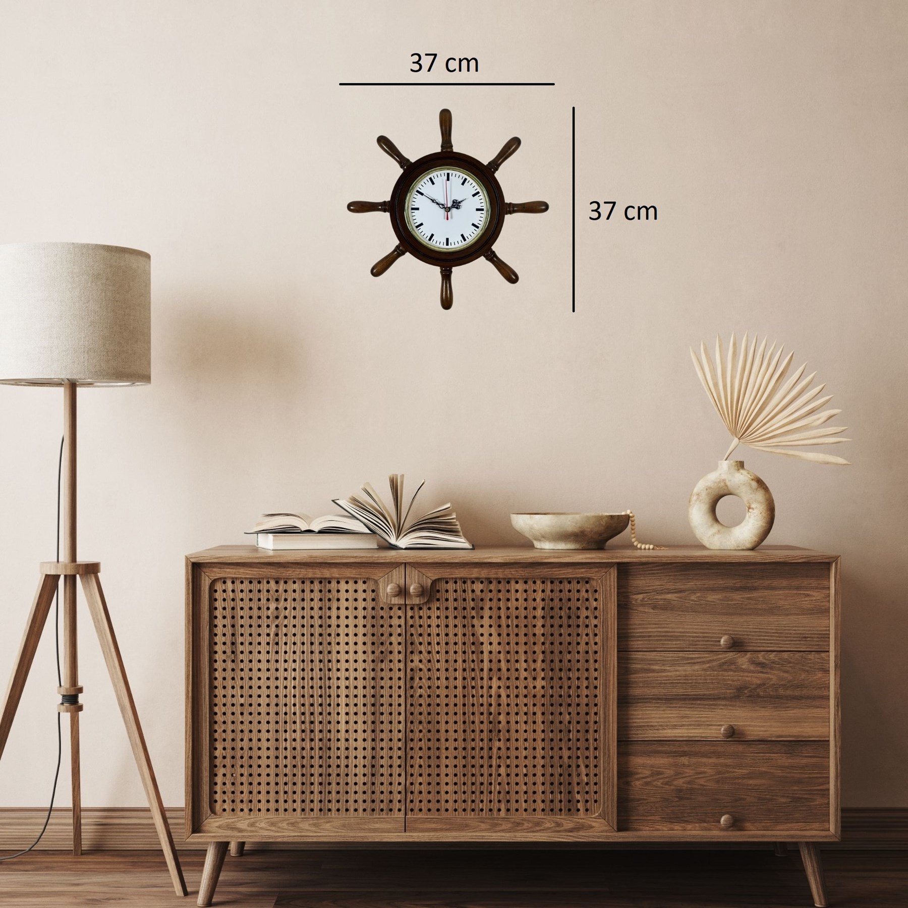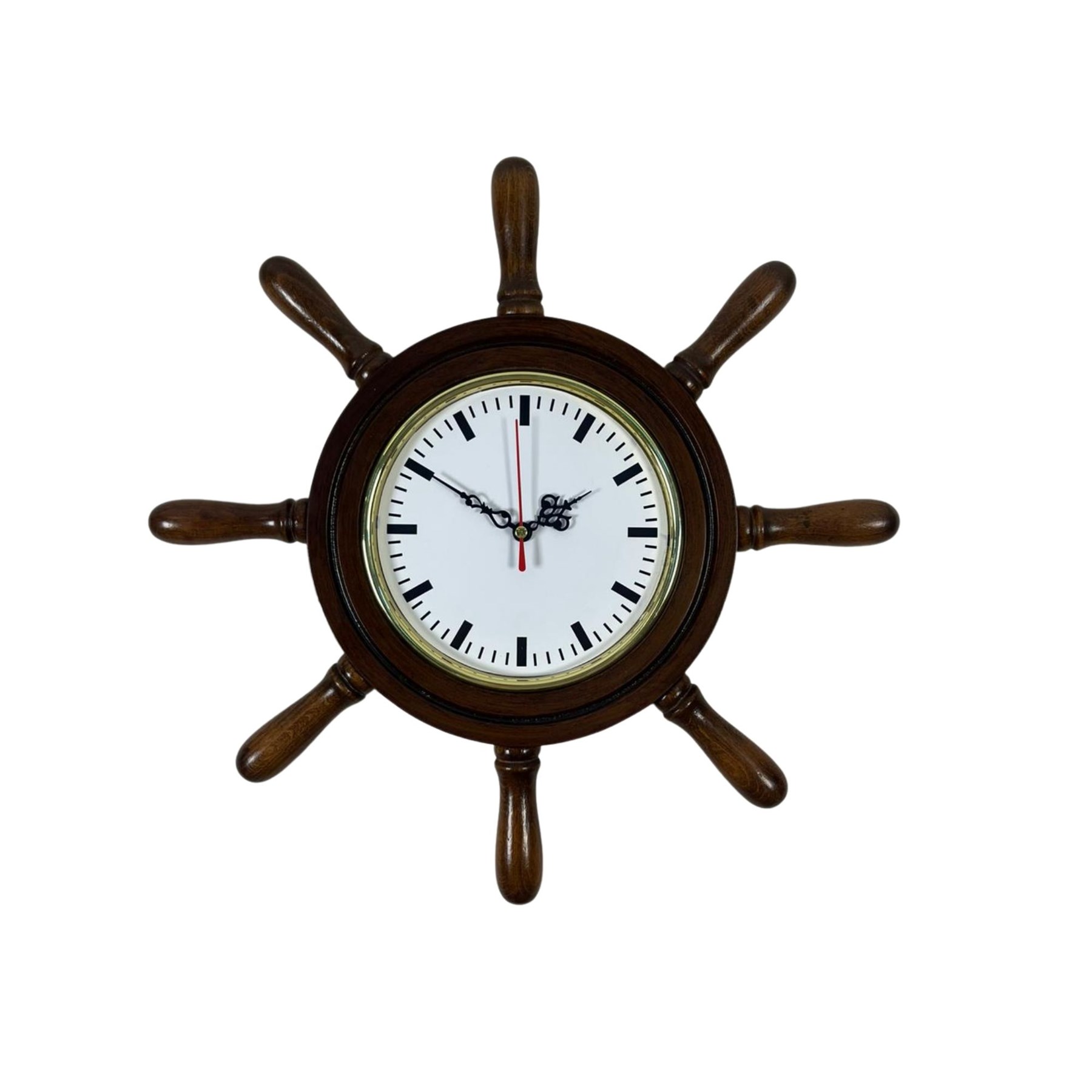 Denizcilik temalı dekorasyonlardan ilham alınarak tasarlanan 37 cm Eskitme Dümen Duvar Saati, bulunduğu ortama klasik ve şık bir marin atmosfer kazandırır. Gemi dümeni formundaki özgün tasarımı sayesinde özellikle salon, ofis, çalışma odası, yazlık ev, kafe ve restoran dekorasyonları için dikkat çekici bir duvar saatidir.