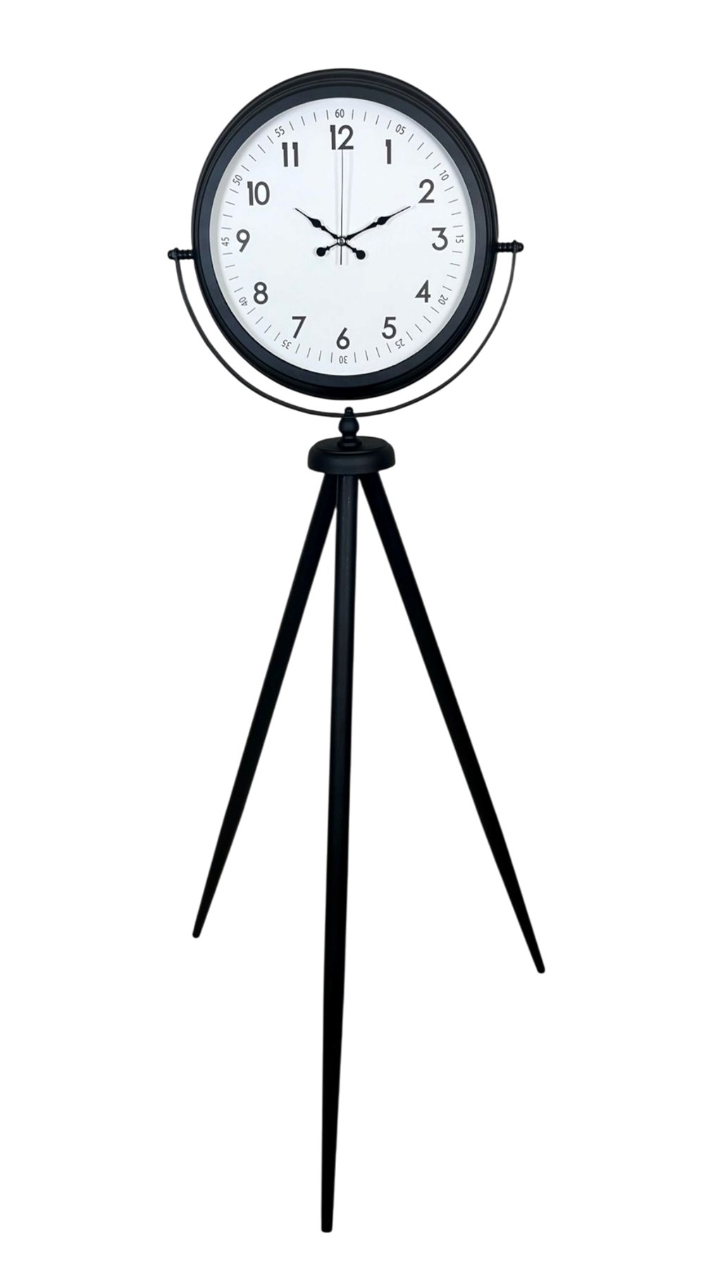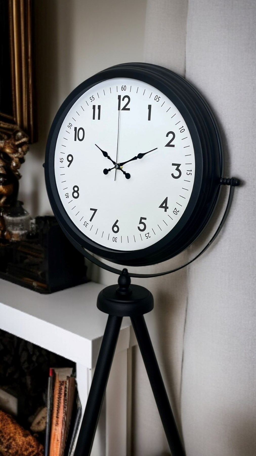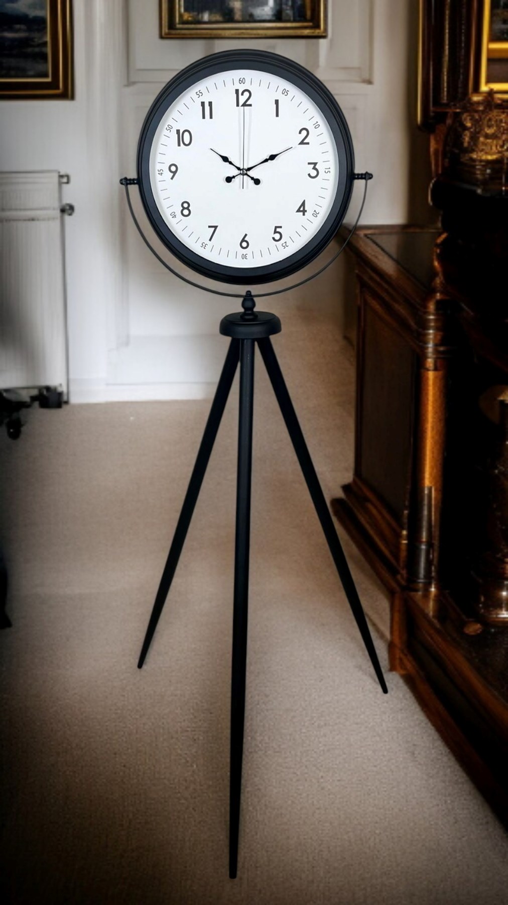 Üç ayaklı tripod formu, bu saati klasik yer ve duvar saatlerinden ayırarak dekoratif bir obje niteliği kazandırır. Dengeli ayak yapısı sayesinde zeminde sağlam durur, güvenli kullanım sağlar. Siyah metal gövdesi hem modern hem de endüstriyel dekorasyon stilleriyle mükemmel uyum sağlarken; klasik mekânlarda da güçlü bir kontrast oluşturarak şıklığı ön plana çıkarır.