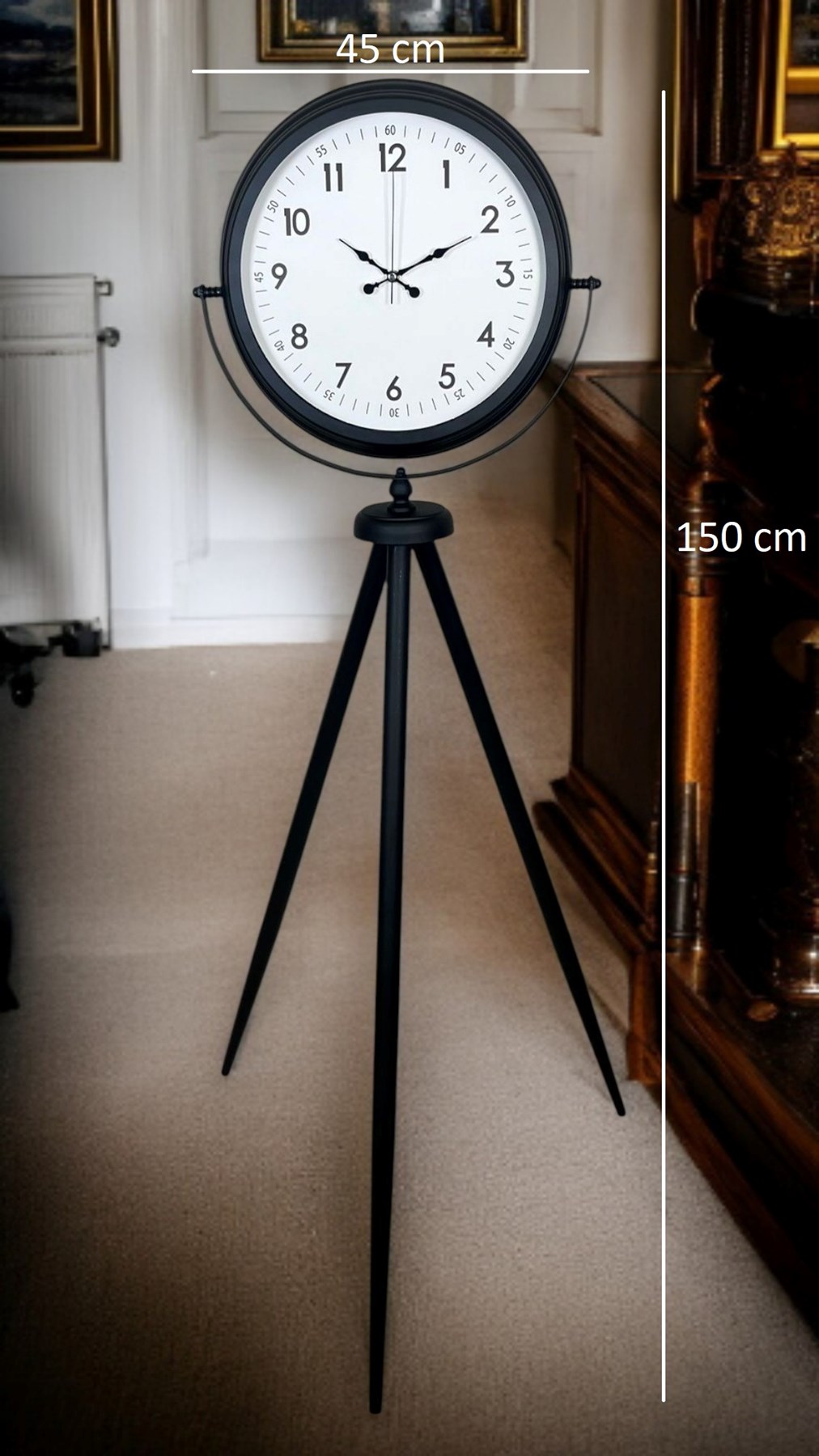 Zarif detaylarla tasarlanmış siyah tripod ayaklı dekoratif saat, modern dekorasyon anlayışını klasik saat estetiğiyle buluşturarak yaşam alanlarına güçlü bir karakter kazandırır. 150 cm yüksekliği sayesinde mekânda dikkat çekici bir duruş sergiler ve salon, ofis, vitrin ya da geniş alanlarda dekorasyonun odak noktası haline gelir.