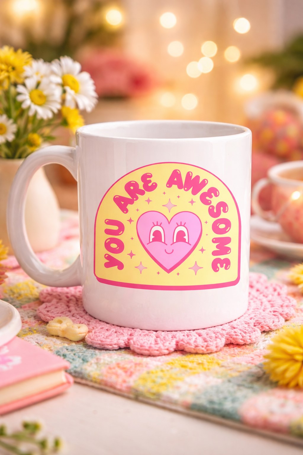 You Are Awesome Yazılı Kalpli Tasarım Porselen Kupa MODEL 187 – Motivasyon Mesajlı Sevimli Kahve Kupası – Hediye Kupa Bardak