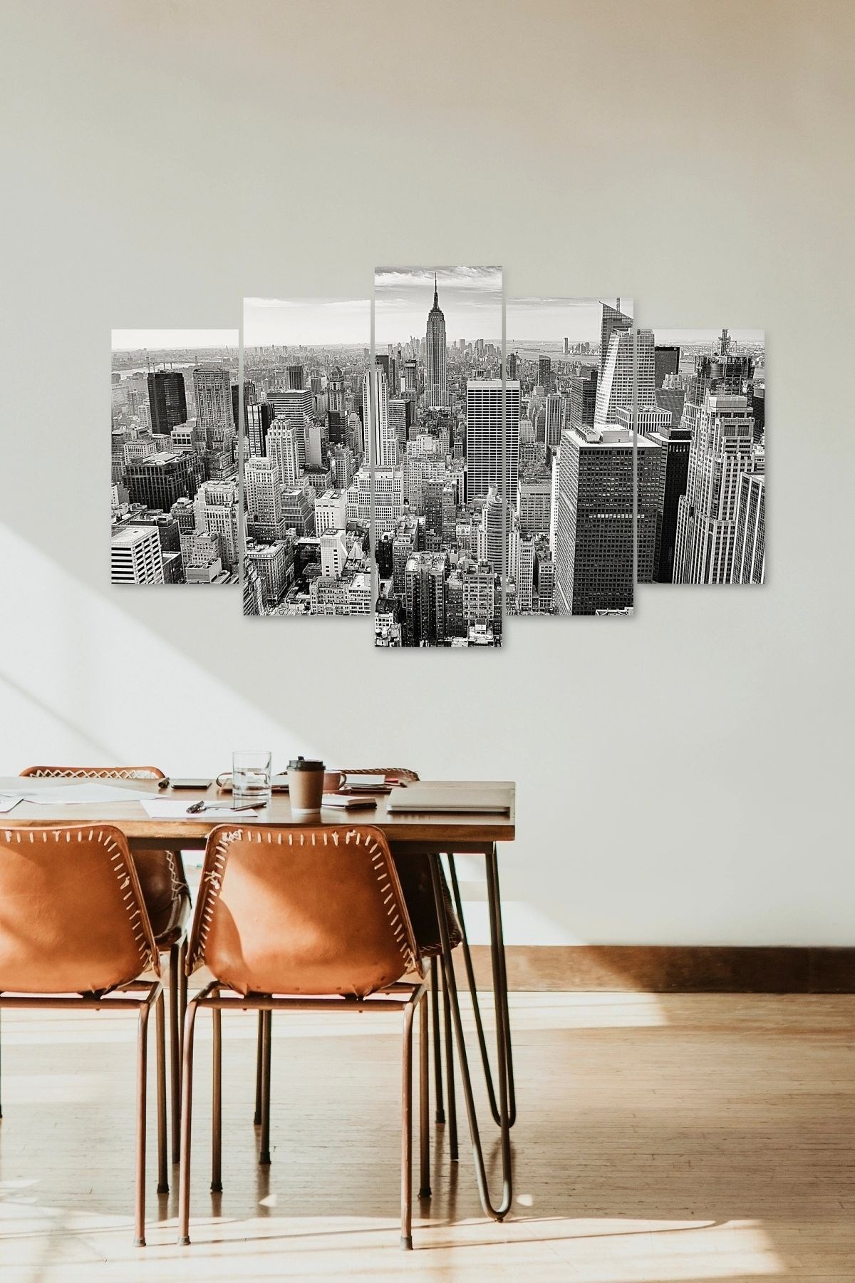 Modern dekorasyonun vazgeçilmez bir parçası olan bu 5 parçalı MDF tablo, evinizin veya ofisinizin atmosferini zenginleştirir; Dayanıklı ahşap malzemesiyle uzun ömürlü kullanım sunar ve modern tasarımıyla mekanınıza şıklık katar; Gökdelen şehir manzarası temalı bu tablo, şehir hayatının dinamik enerjisini yaşam alanlarınıza taşır;
