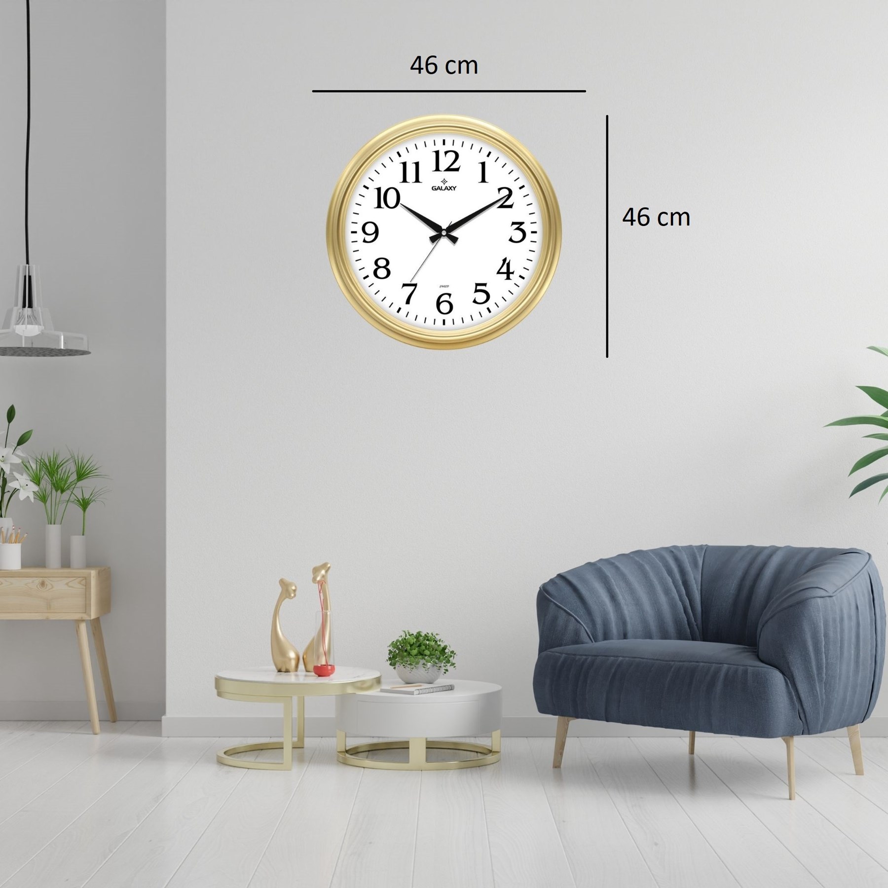 Şık ve sade tasarımıyla öne çıkan 46 cm gold duvar saati, yaşam alanlarına zarif ve modern bir dokunuş kazandırır. Altın tonlarındaki çerçevesi ve sade beyaz kadranı sayesinde hem klasik hem de modern dekorasyonlarla kolayca uyum sağlar.