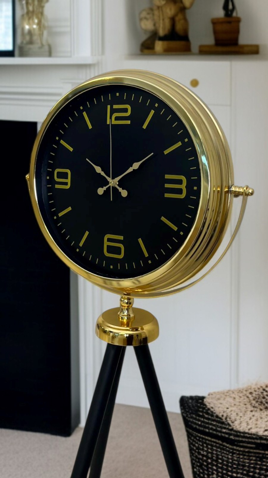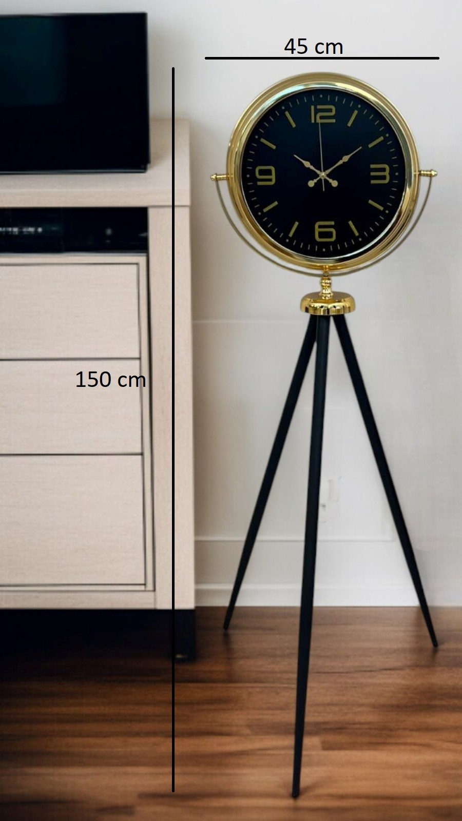 Gold metal çerçevesi ile siyah kadranın asil uyumu, ürüne lüks ve zamansız bir görünüm kazandırır. İnce formda tasarlanmış siyah tripod ayakları ise hem modern bir estetik sunar hem de saatin zeminde dengeli ve sağlam şekilde durmasını sağlar. Bu tasarım, salonlar, ofisler, lobiler, showroomlar ve prestijli yaşam alanları için ideal bir tamamlayıcıdır.