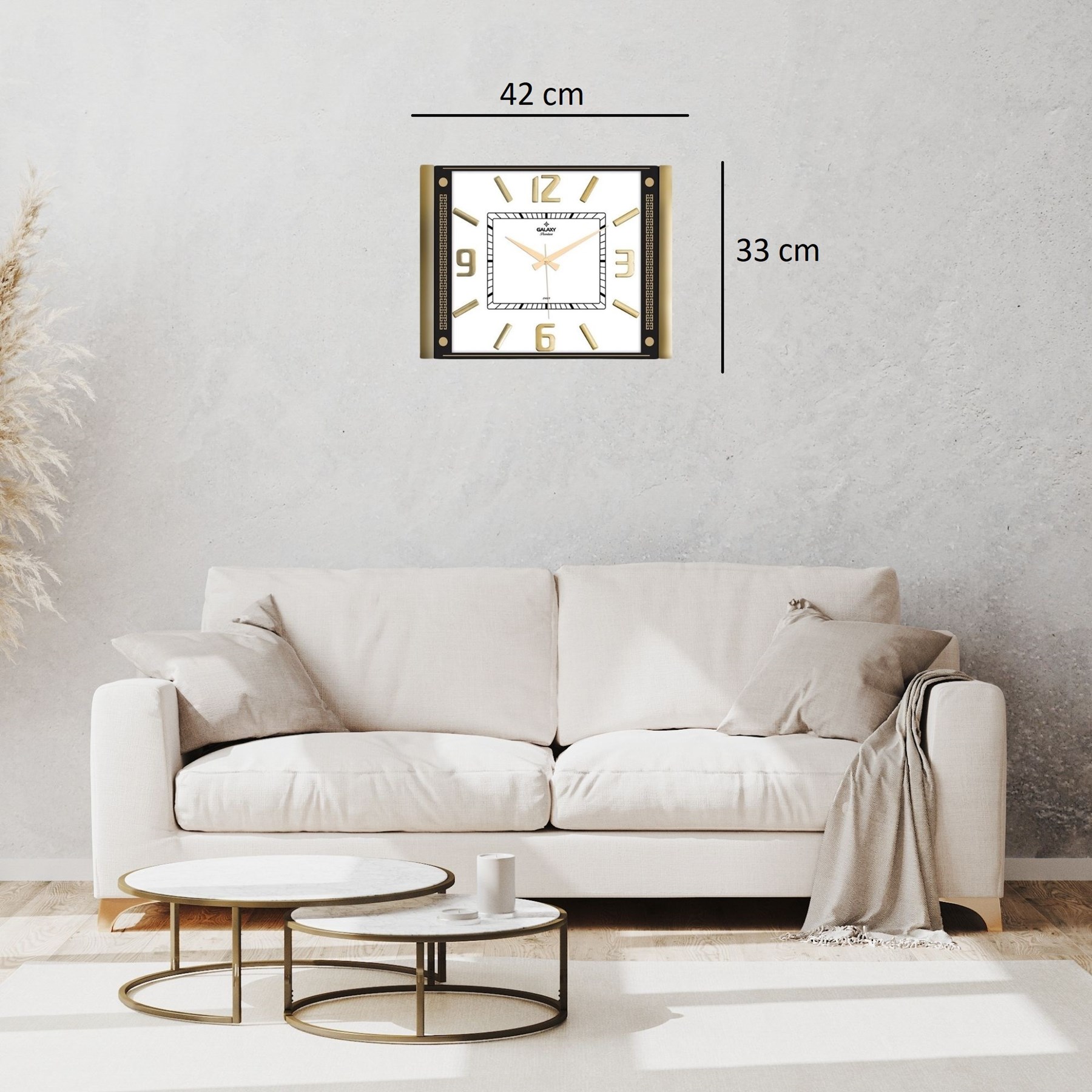 Dikdörtgen formu ve zarif gold detayları ile klasik duvar saatlerinden farklı bir dekoratif görünüm sağlar. Modern salonlar, ofisler, çalışma alanları ve kafe dekorasyonları için şık bir tamamlayıcıdır. Altın tonları sayesinde dekorasyona prestijli bir dokunuş katar.