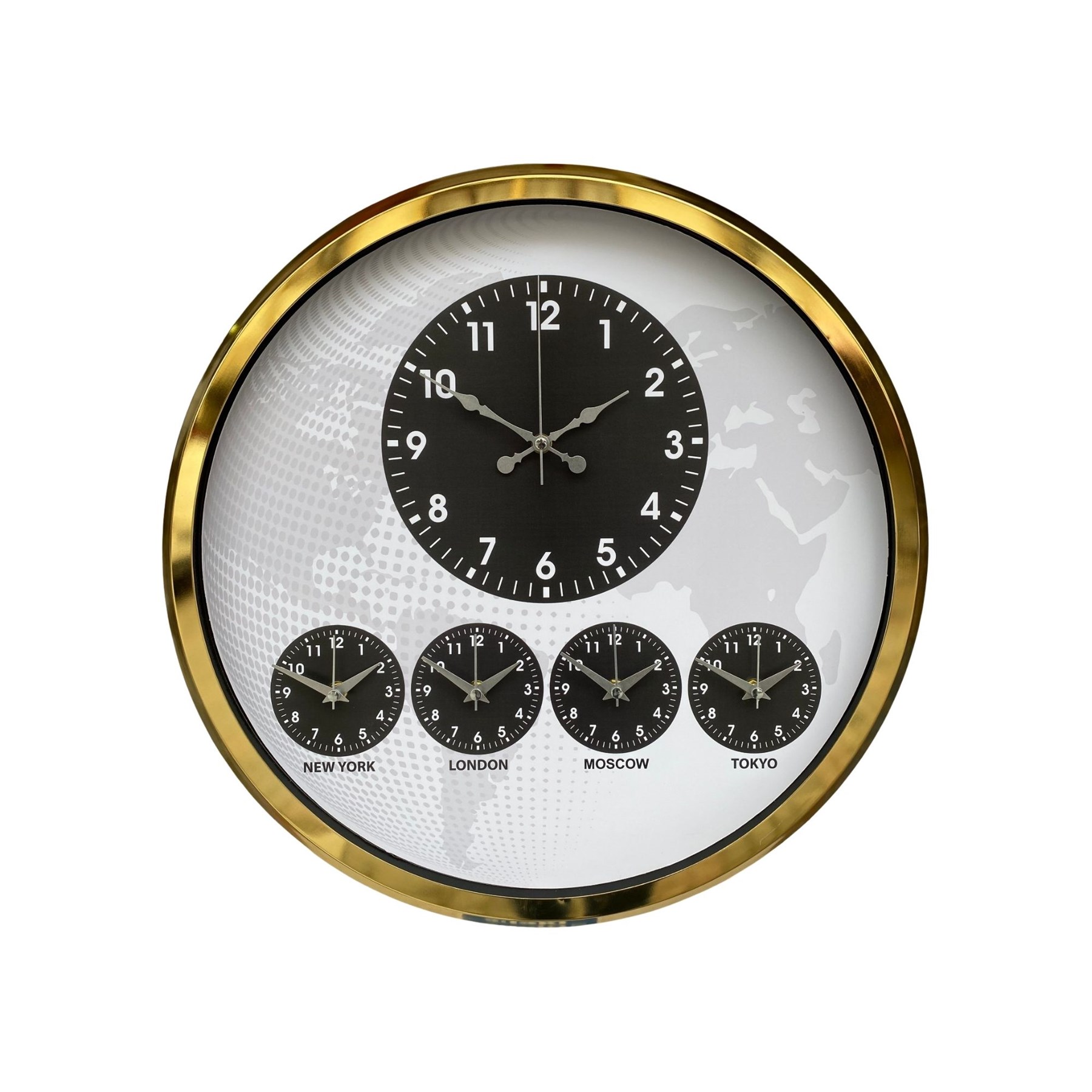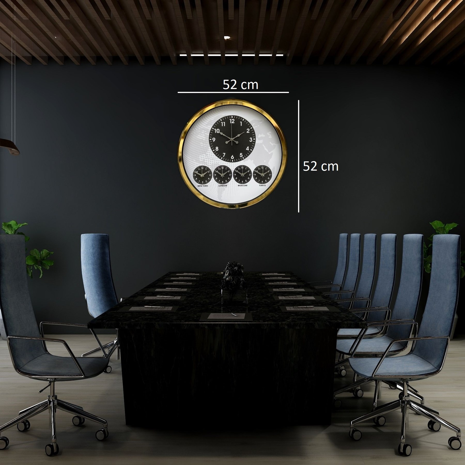 Merkezde yer alan büyük ana saat günlük kullanım için net ve kolay okunabilir yapı sunarken, alt bölümde bulunan New York – London – Moscow – Tokyo zaman göstergeleri uluslararası iş yapan firmalar için fonksiyonel bir çözüm sağlar.