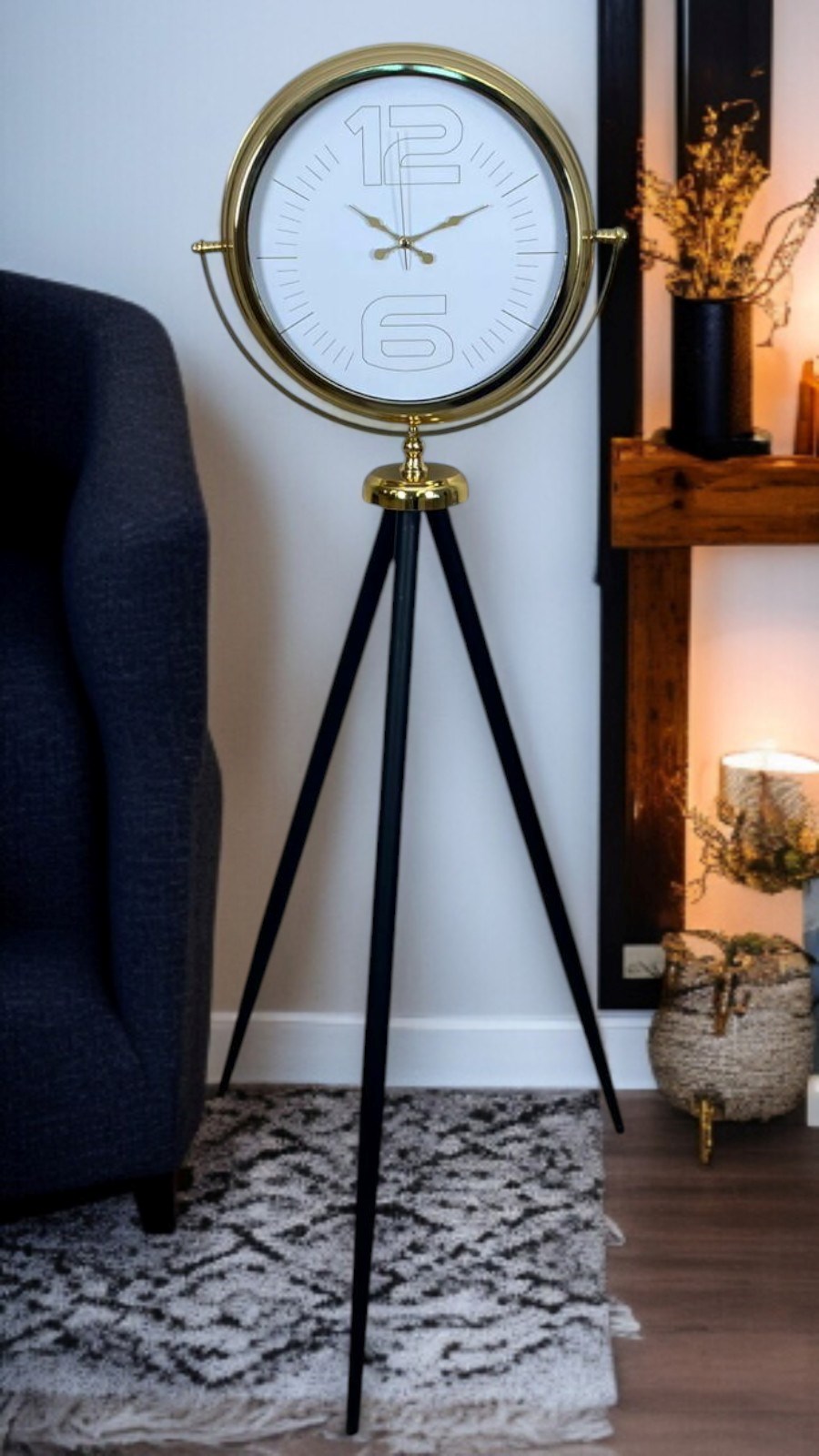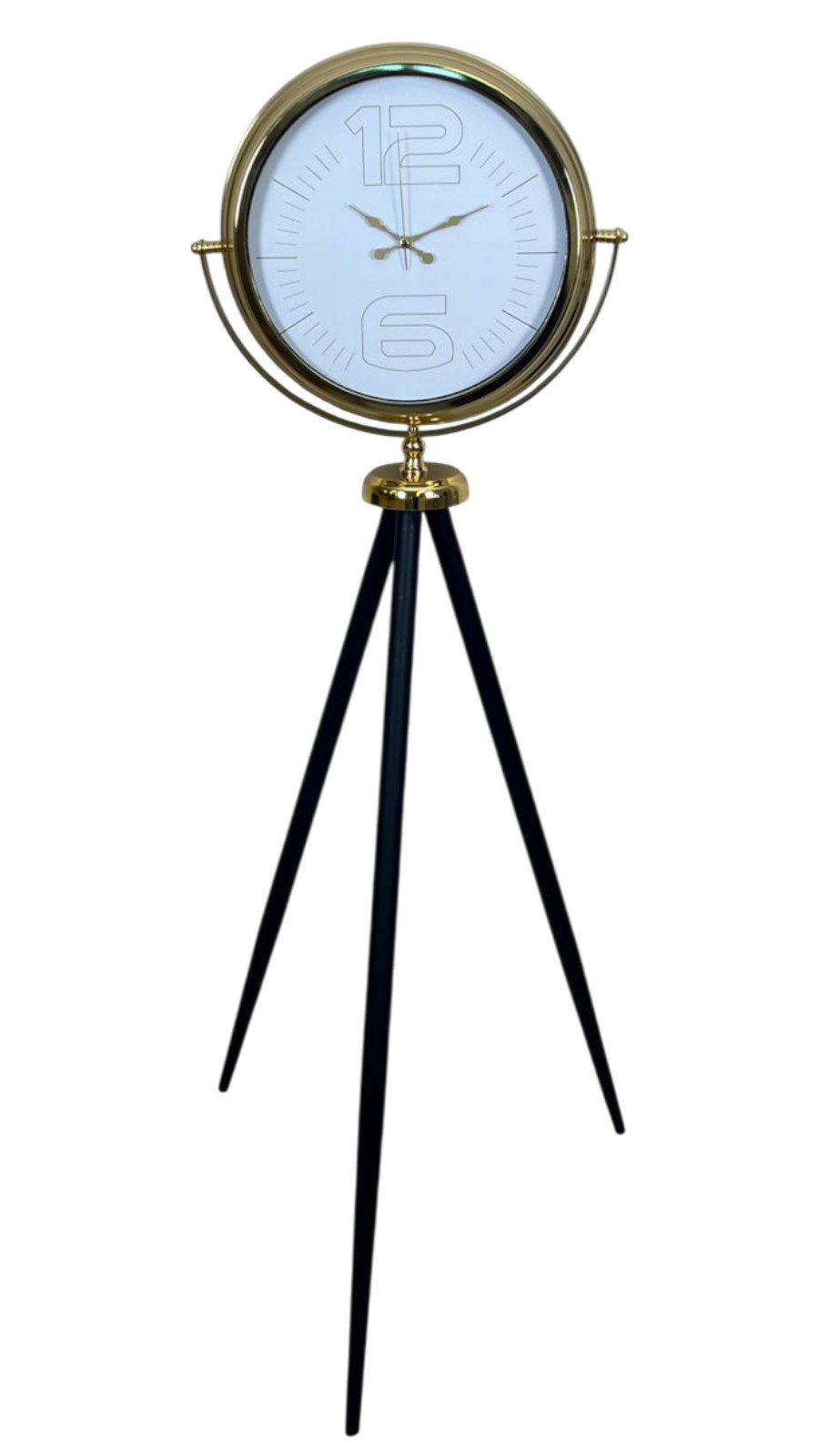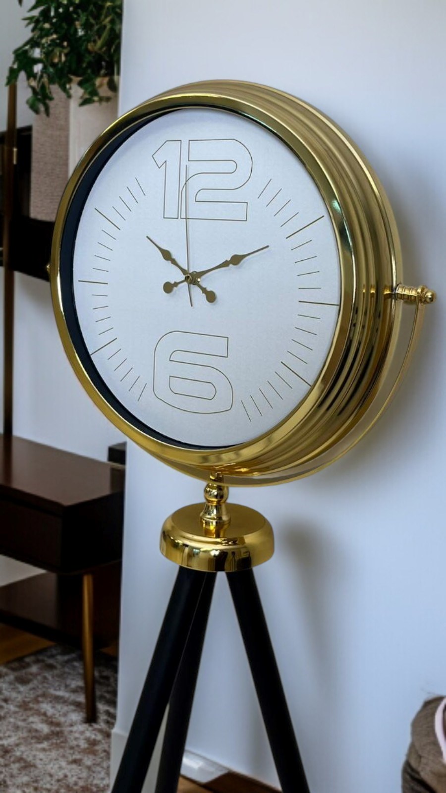 Beyaz kadranın aydınlık ve sade görünümü, gold metal çerçeveyle birleşerek mekâna zarif bir ışık katar. Siyah tripod ayaklar ise modern ve dengeli bir duruş sunar; saatin zeminde sağlam şekilde konumlanmasını sağlar. Geniş ve sade kadran yapısı, uzaktan dahi rahat okunabilirlik sunar.